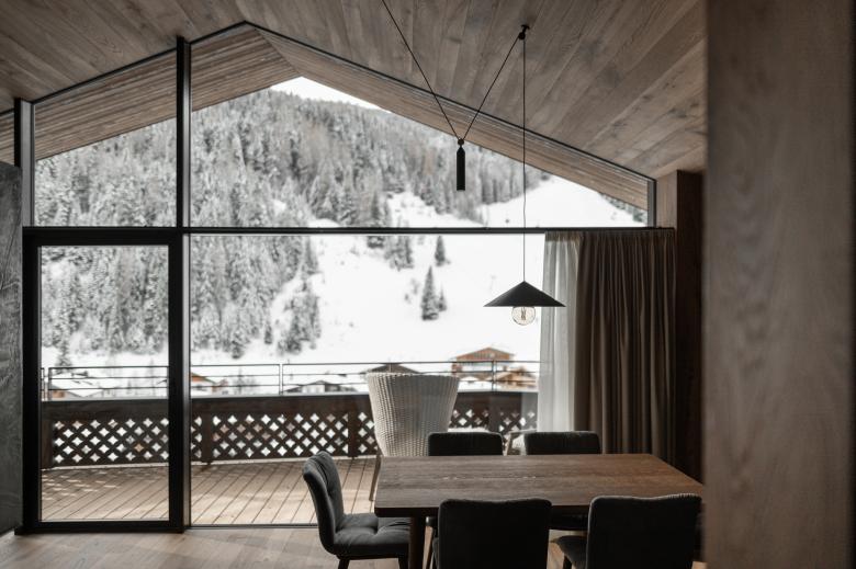 This chalet in Selva di Val Gardena blends harmoniously into its natural surroundings, characterized by the enchanting Alpine landscape and the traditional architecture of the Dolomites. The project originates from the combination of two houses that merge into a single volume, articulated over three above-ground floors and carefully integrated into the existing slope.