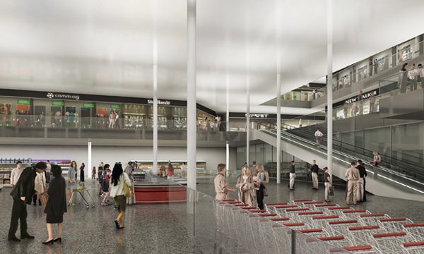 Der Markt wird mit der ersten Parkebene zusammengelegt. Neben den praktischen Vorteilen für Kunden mit dem Auto eröffnet sich für den Fussgänger und Mall - Flaneur ein phantastischer Überblick von atemberaubender Großzügigkeit. Außerdem erhält der Markt durch die vierseitige Fassade und die zweiseitige Galerie eine enorme Aufwertung.