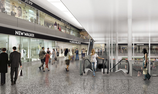 Die attraktivste Verkaufsseite, Nord- und Nordwestecke werden zum zweigeschossigen Schaufenster, die Eingänge der Mall kreuzen sich an den Magneten Großmarkt und Textilgeschäft.