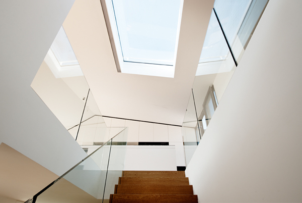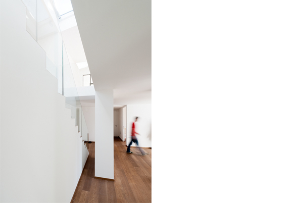 Die beiden ineinander verschnittenen Satteldächer sorgen für ein lichtdurchflutetes Wohnambiente über zwei Etagen. Die dadurch entstehenden Dachschrägen betonen bewusst die Ecken und Kanten des Wohnungsumrisses und führen die Dachlandschaft der angrenzenden Blockrandbebauung fort.
