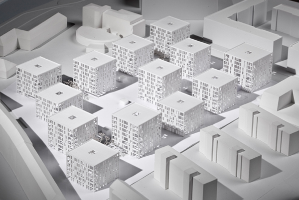 Die neue Wohnbebauung auf dem Areal der ehemaligen Eugenkaserne besteht aus 13 quaderförmigen Baukörpern mit wechselnden Höhen von sechs bis acht Geschossen.