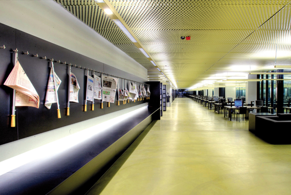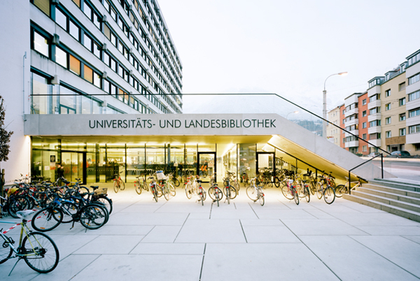 Die Situierung der neuen Bibliotheksräume auf Straßenniveau ermöglicht eine organisatorische Trennung zum Fakultätsbetrieb, einen externen ebenerdigen Eingang von der Universitätskreuzung und eine kurze unterirdische Anbindung an die alte Universitätsbibliothek.