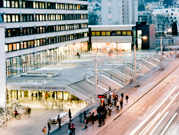 Der 1-geschossigen Baukörper als ansteigende Tribüne erschließt einen neuen zentralen Eingang zum Universitätscampus. Das Freispielen der Erdgeschoßzone orientiert die Universität zur Stadt hin und setzt durch den neu gewährten Einblick ein offenes Signal nach aussen.