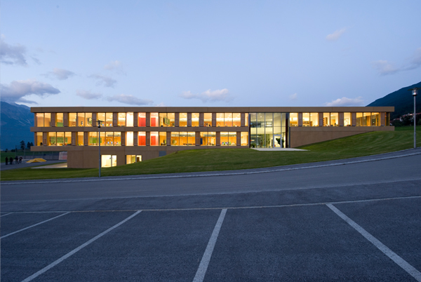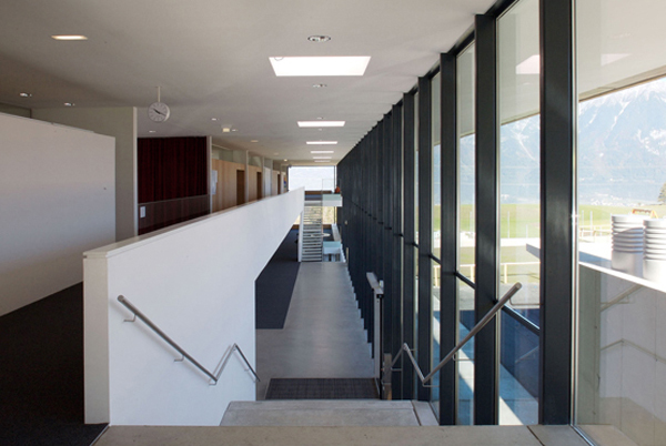 Alle Klassen, Lehrerzimmer, Direktion, Bibliothek, Begegnungsräume, und Treffpunkte erlauben immer den Blick ins Freie, auf die Natur und das Bergpanorama und begegnen somit der Besonderheit dieses Ortes.
