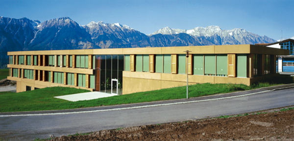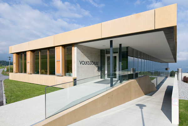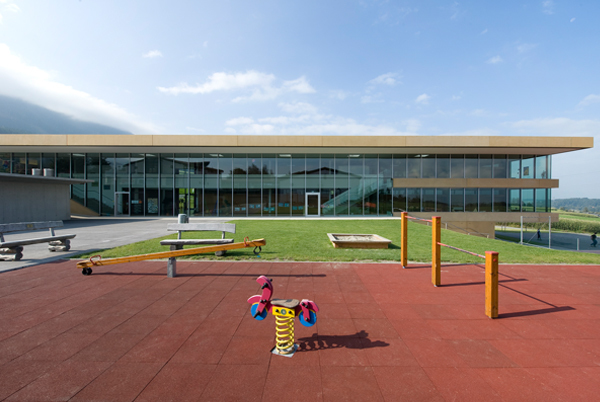 Der riegelförmige Baukörper begrenzt durch seine Ausrichtung das Areal von Kindergarten, Sporthalle, Gemeindesaal und Feuerwehr und bildet einen neuen Platz, der als Schulhof den Blick über das Inntal in Richtung Nordkette einrahmt. Die allgemeinen Erschließungs- und Pausenflächen sind zum Schulhof orientiert, die Klassenräume blicken in die Natur, die zweigeschossige durchgesteckte Aula verbindet das künstliche mit dem gewachsenen Umfeld.
