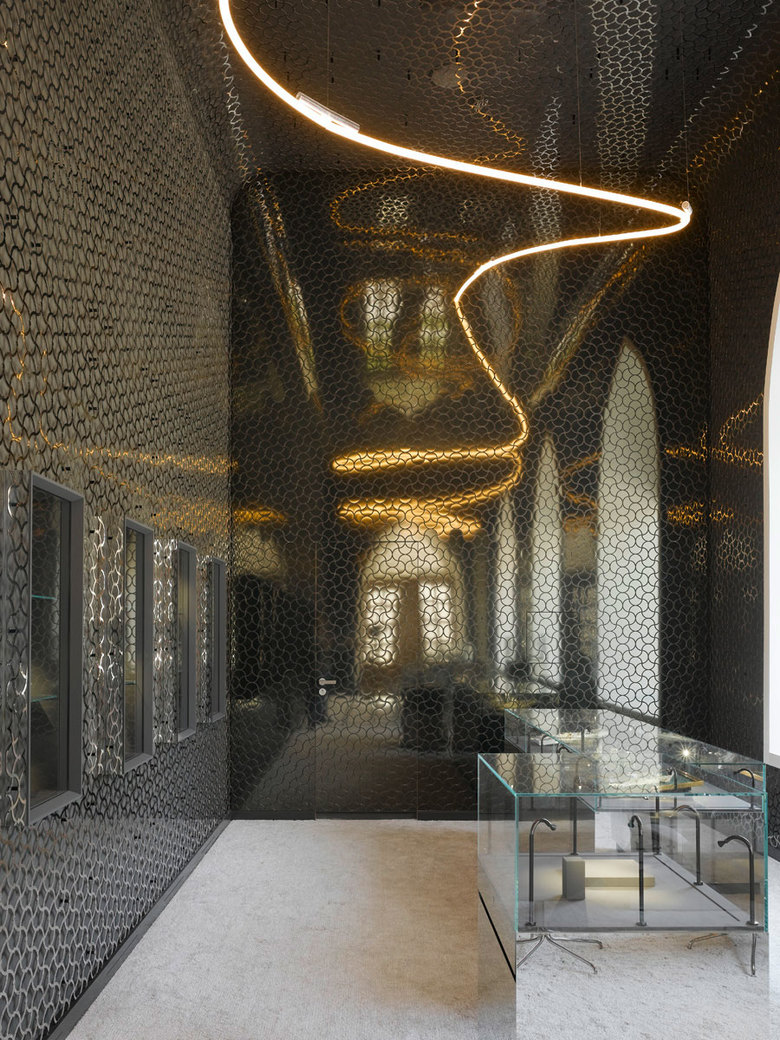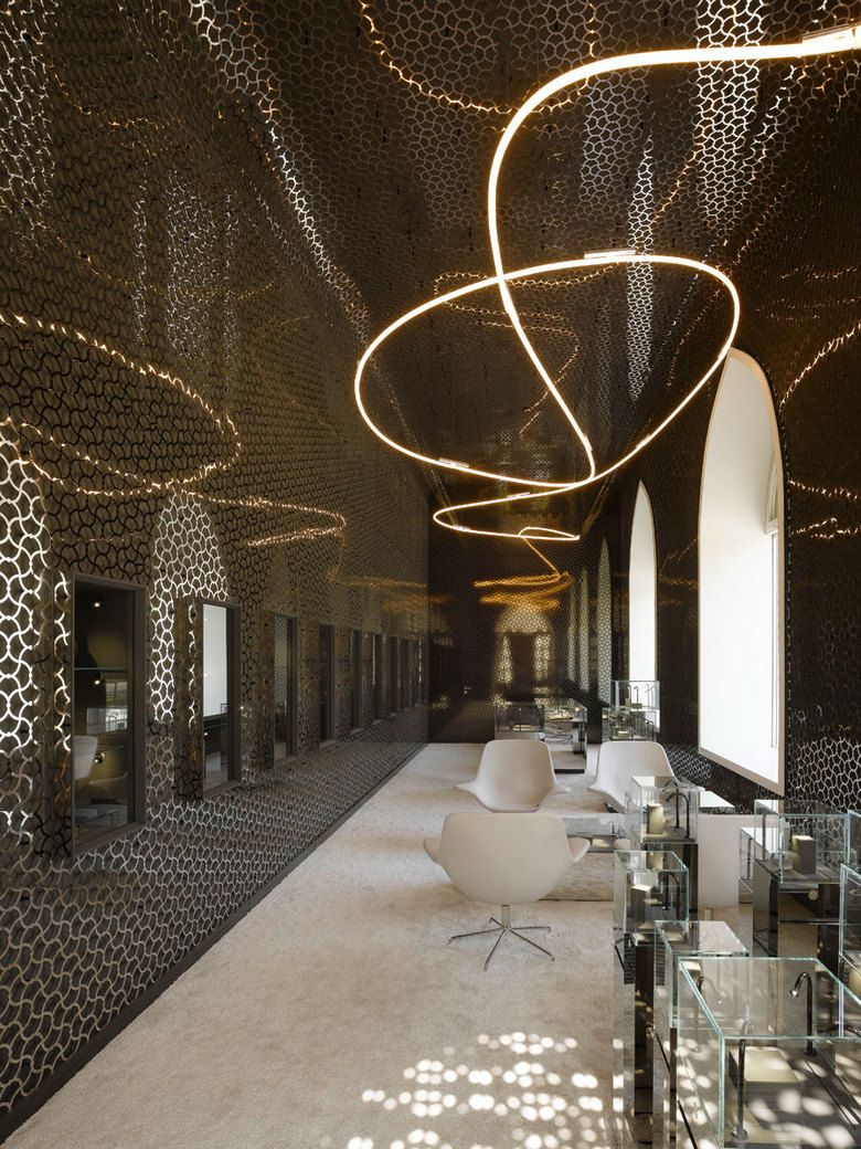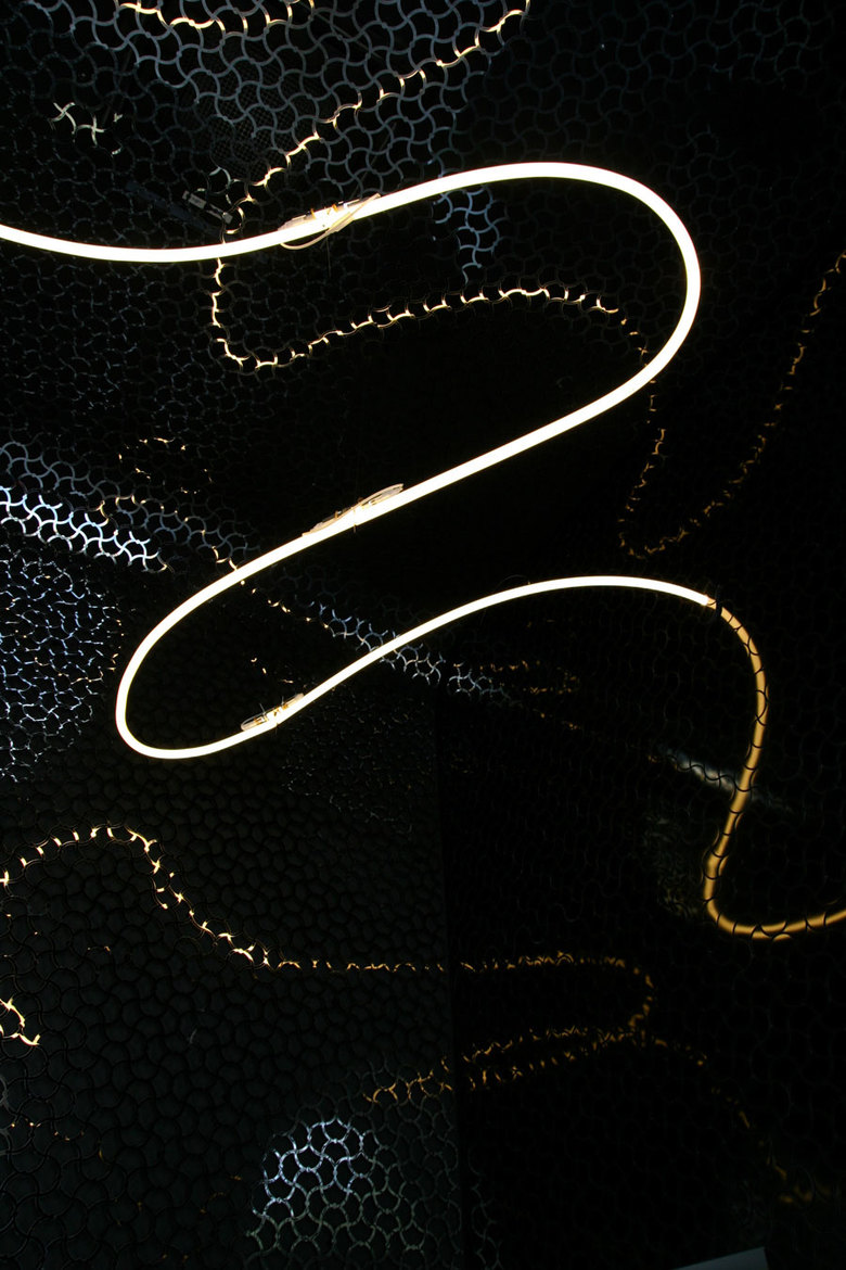 Die raumbildende Verkleidung der Galerie aus einem gelaserten, hochglanzpolierten Edelstahlornament sollte nicht durch eingebaute Leuchten gestört werden. Eine frei skizzierte, geschwungene Neonlinie schwebt daher als einziges Lichtelement im Raum.