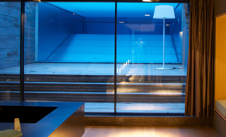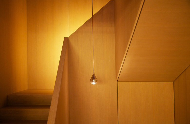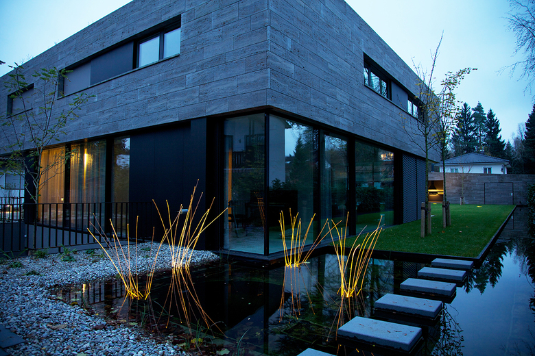 durch eine indirekte Wegebeleuchtung zum Hauseingang geführt; ein Teich wurde mit der Glasfaser-Sonderleuchte "Munich Reeds" in ein poetisches, schimmerndes Lichtobjekt verwandelt. Im Spa- und Wohnbereich sorgen blendungsbegrenzte Downlights für hohen visuellen Komfort, im indirekt beleuchteten Treppenhaus schwebt ein "Hausgeist" im Treppenauge: ein hochglanzpolierter Tropfen aus poliertem Aluminum, der von unten angestrahlt wird. Die Zimmer und Bäder der Familie werden durch ein speziell für das Projekt gestaltete "Leuchtenfamilie" erhellt: spielerisch in verschieden Höhen und Winkeln abgependelt, sorgen Leuchten mit farbigen Stoffschirmen und Stoffkabeln für direktes und allgemeines Licht. Sie sind flexibel an einem Hakenraster fixiert und begleiten das Wachstum (der Kinder) ebenso wie weitere Veränderungen innerhalb der Räume.