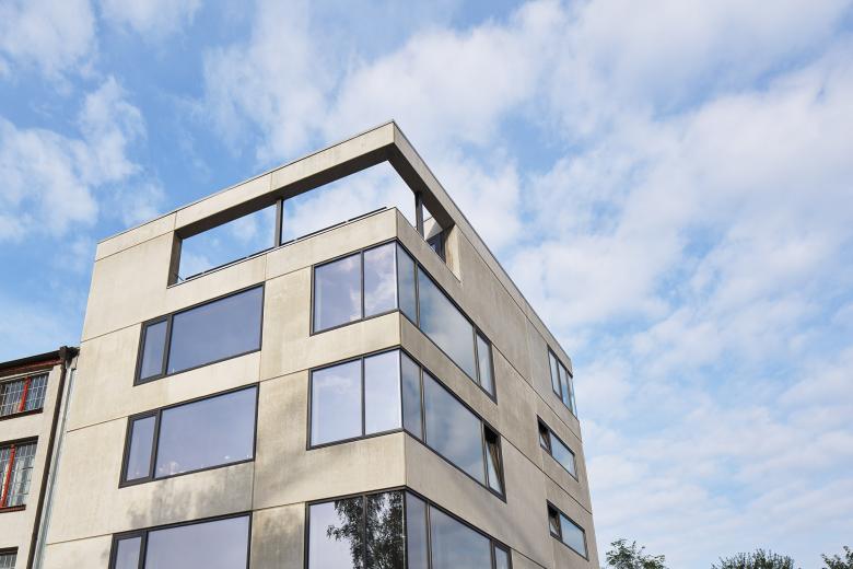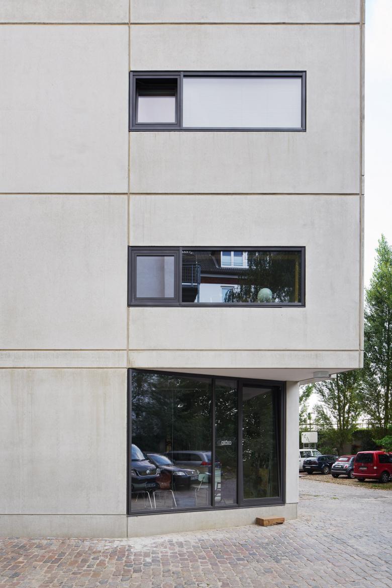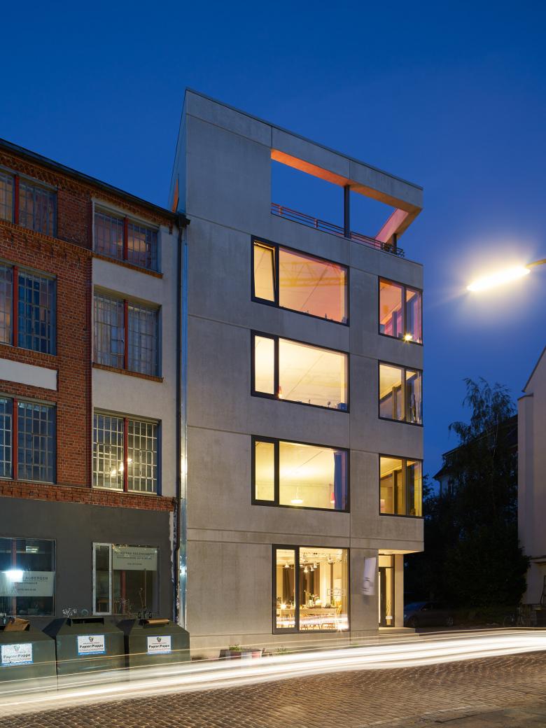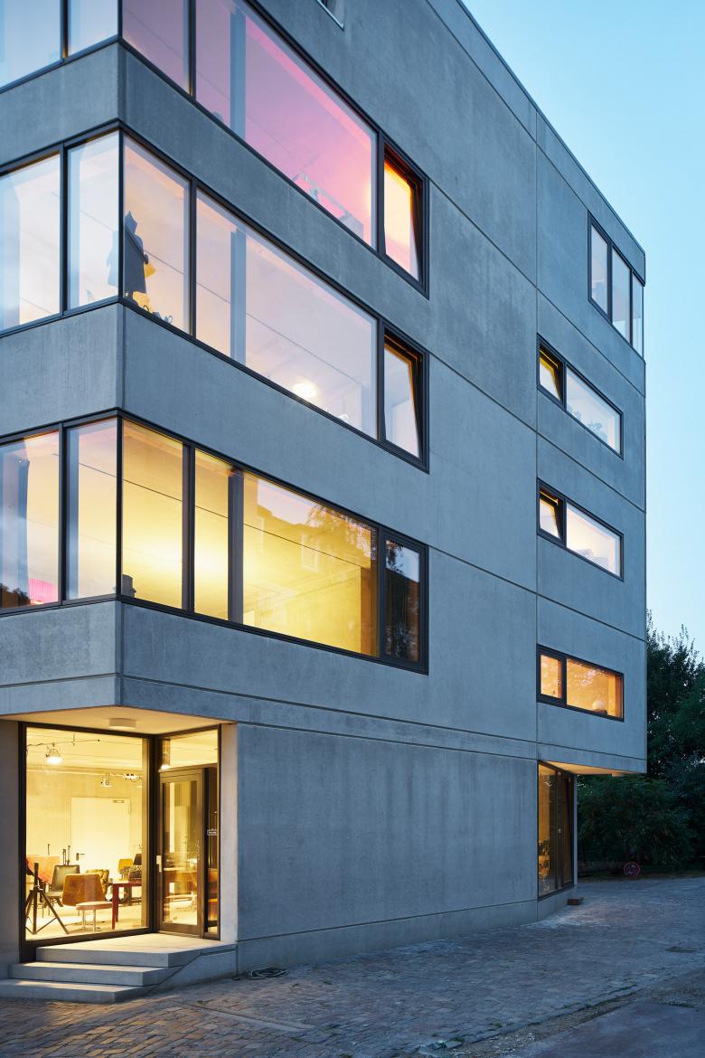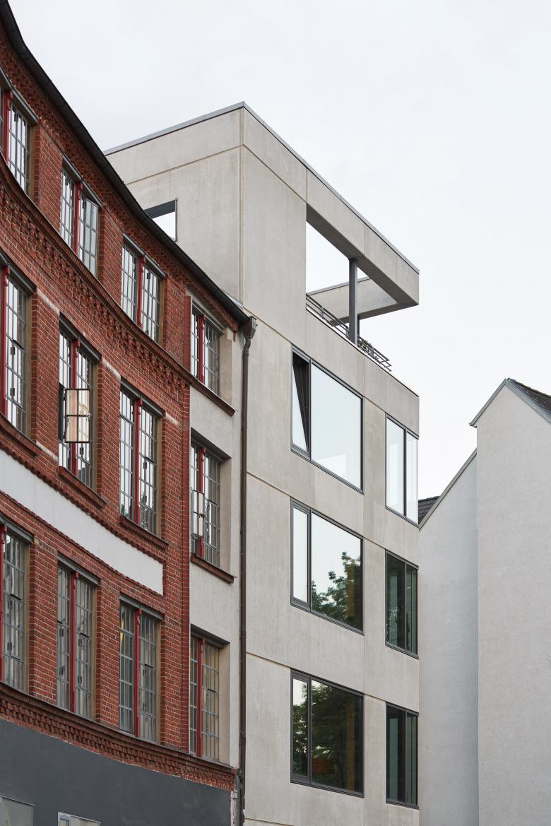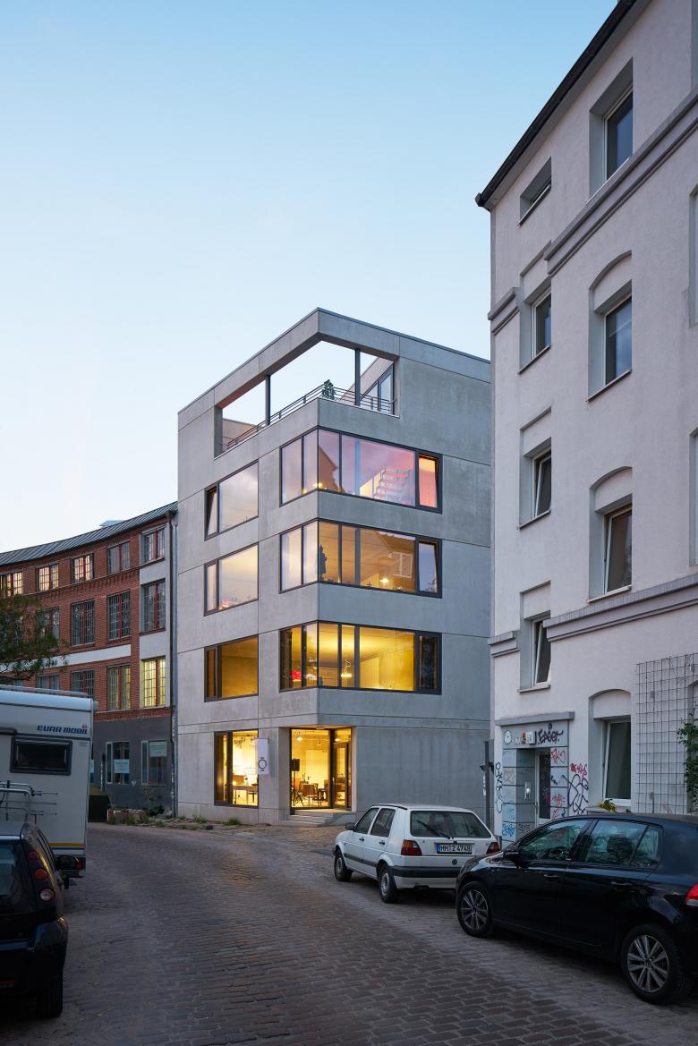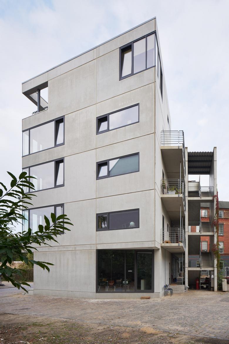 Ein fünfgeschossiger Kopfbau aus Sichtbeton ergänzt den Torso der ehemaligen Goldleistenfabrik in der Gaußstraße in Altona. Auf ca. 500 qm entstanden Ateliers und Werkstätten und ergänzen die Flächen in dem Fabrikgebäude von 1900. Der neue Baukörper schließt die im Krieg entstandene Baulücke, die durch Zerstörung des Mittelteils der Fabrik entstand, nicht in Gänze. Das zeitgemäße Material Beton soll Ergänzung aber auch Weiterbauen thematisieren. Neubau und Baulücke befinden sich genau im Knick der Gaußstraße. Durch seine um ein Geschoss überhöhte kompakte Baumasse wirkt der Neubau daher aus beiden Richtungen als Gelenk und visueller Endpunkt des Straßenraums. Die flächenbündig eingesetzten Übereckfenster leiten vom Straßen- zum Hofraum über. Sockel und Dach werden damit wie im Bestand thematisiert. Unbehandelte hölzerne Dielenböden und wenige weiß gespachtelte und gestrichene Wände stehen im Kontrast zum vorherrschenden Material Beton.