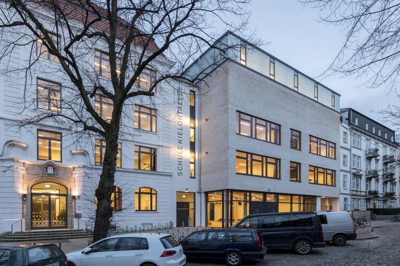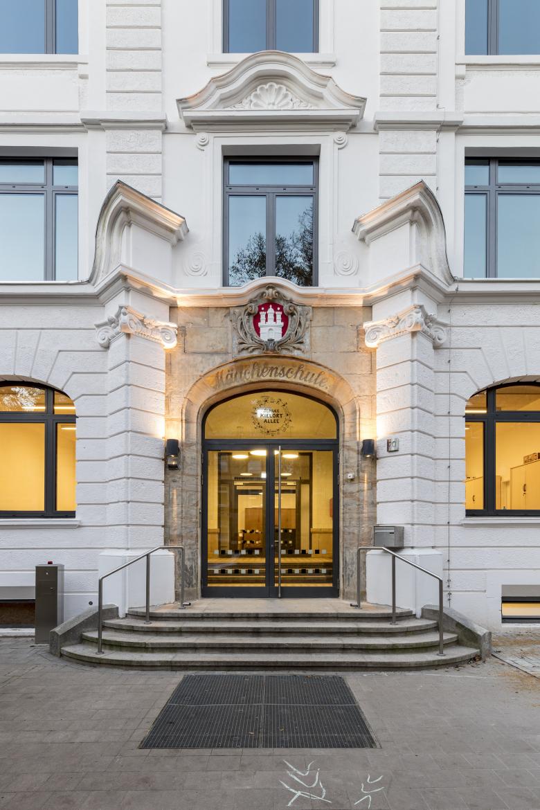 Das Schulgebäude an der Kielortallee im extrem dicht besiedelten Stadtteil Hamburg-Eimsbüttel stammt aus der Kaiserzeit und soll für die heutigen Bedürfnisse an einen modernen Grundschulunterricht umgebaut und saniert werden. Ein Ersatzbau von 1958 für eine im 2.Weltkrieg zerstörte Turnhalle an der Straße wird abgerissen und durch einen Erweiterungsbau mit Pausenhalle, Sporthalle und Unterrichtsräumen ergänzt. Die neue großzügige Pausenhalle im Erdgeschoss stellt eine Verbindung zwischen Schule und Stadtteil her. Der Neubau fügt sich durch seine Form, durch die Zonierung seiner Geschosse sowie durch Farbe und Materialität in das gründerzeitliche Straßenbild der Kielortallee ein.