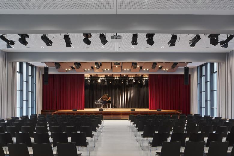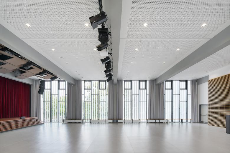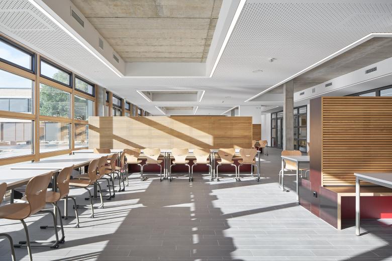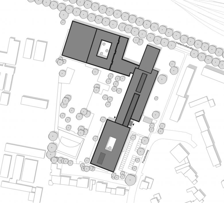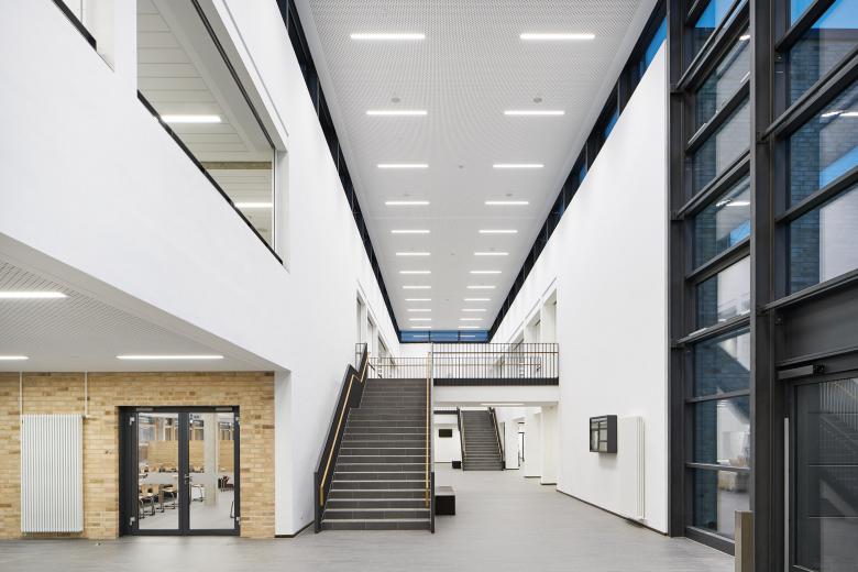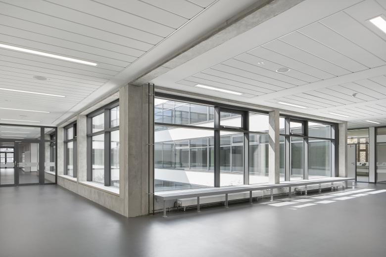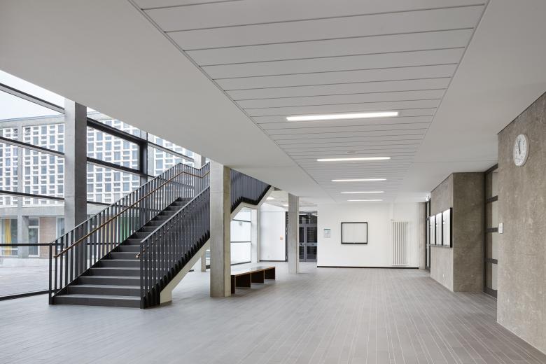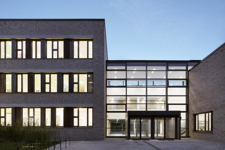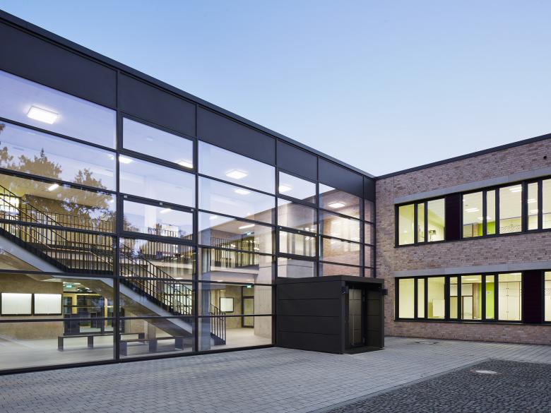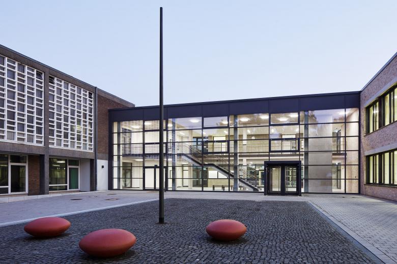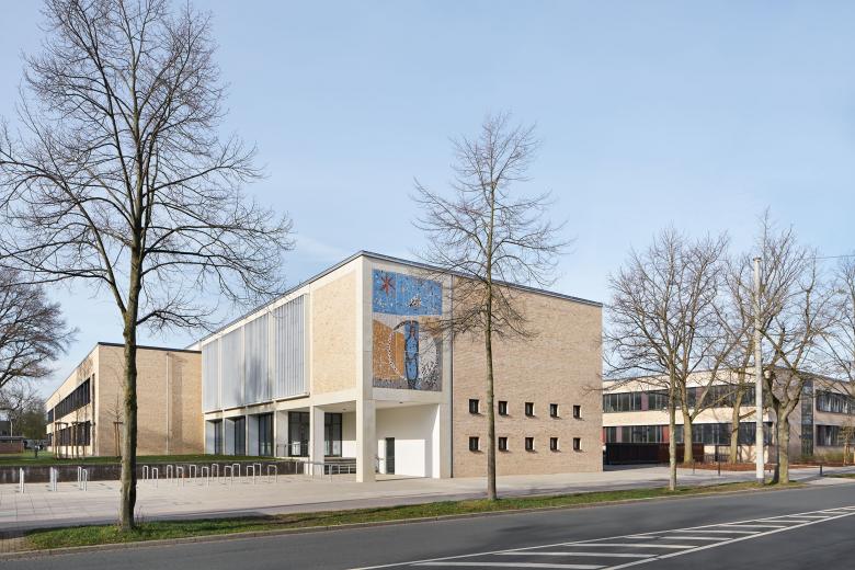 Die zentrale zweigeschossige Eingangshalle an der Haltenhofstraße mit der anschließenden Cafeteria bildet nun ein großzügiges Foyer sowohl für Veranstaltungen in der Aula als auch in der Sporthalle. Der Haupteingang der Schule befindet sich nach wie vor an gewohnter Stelle im Franziusweg. Materialität und die Gliederung der Fassaden mit Bandfenstern binden den weiträumigen Bau zu einem großen Ganzen zusammen.