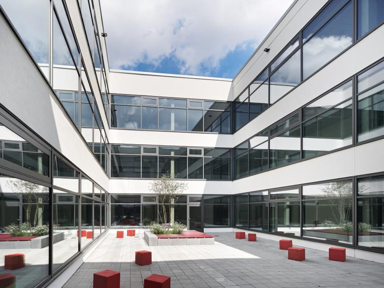 Im 1. BA wurde ein L-förmiger Neubau mit 9 Unterrichtsräumen, Cafeteria und zweigeschossiger Eingangshalle an den Kopfbau der alten Anlage angebaut, der zusammen mit der vorhandenen Aula einen neuen Eingangshof bildet.