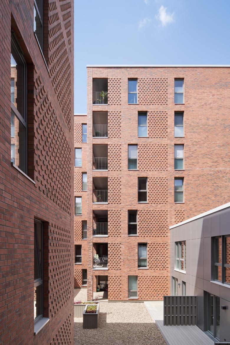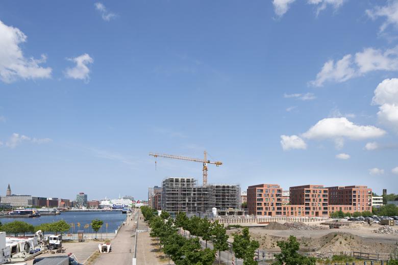 Auf der Grundlage unseres städtebaulichen Masterplans für das Gebiet Kiel Hörn entstand auf dem Baufeld XII im Westen ein Ensemble aus drei siebengeschossigen Wohngebäuden, die mit zweigeschossigen Stadthäusern zu einem städtischen Block zusammengefügt wurden. Im Innern bieten zwei Innenhöfe gute Belichtung für die unteren Geschosse sowie private Gärten für die Stadthäuser. Die turmähnlichen Wohngebäude werden von Norden und Süden erschlossen, was zusammen mit den vielen Eingängen der Stadthäuser für eine Belebung des Straßenraums sorgt. Drei Türme sind als Sechsspänner an einem großzügigen mittigen Treppenhaus konzipiert, von dem aus unterschiedlich große geförderte und frei finanzierte Mietwohnungen zugänglich sind. Alle Wohnungen verfügen über eine Loggia mit Blick auf die Kieler Innenförde. Die Gebäude im Baufeld XII werden einheitlich mit roten Ziegelfassaden errichtet, um die Ensemblewirkung zu stärken.