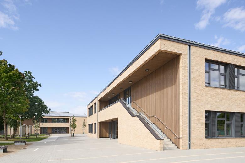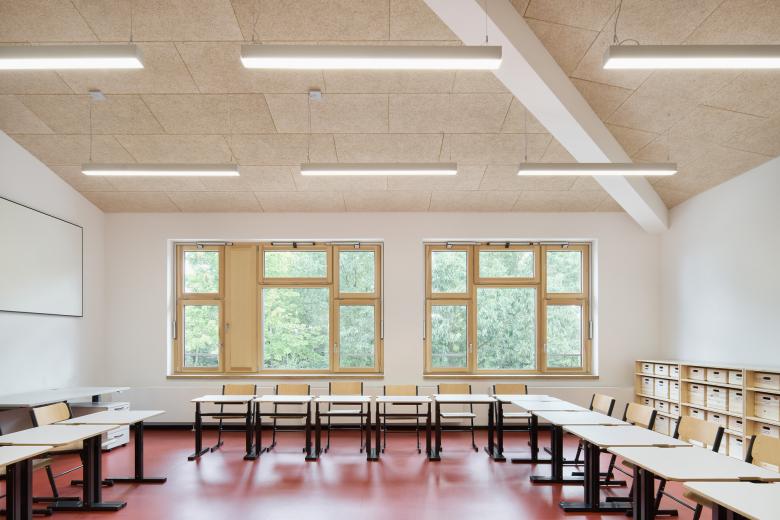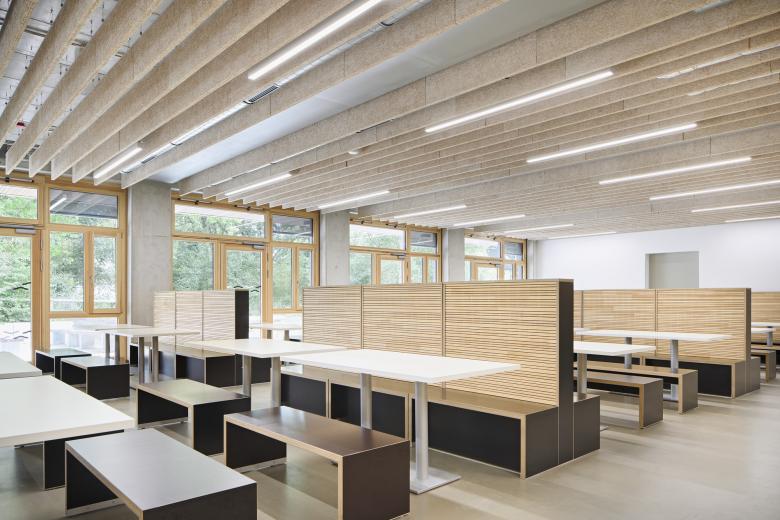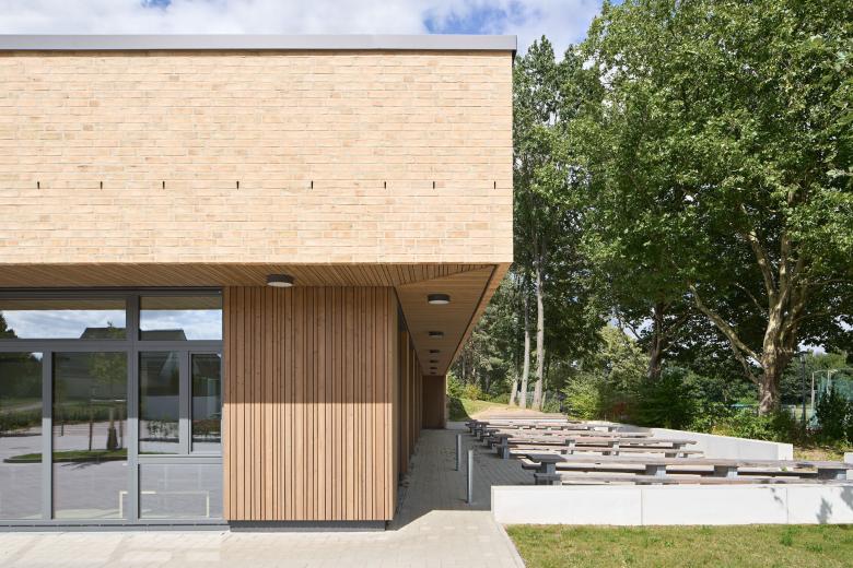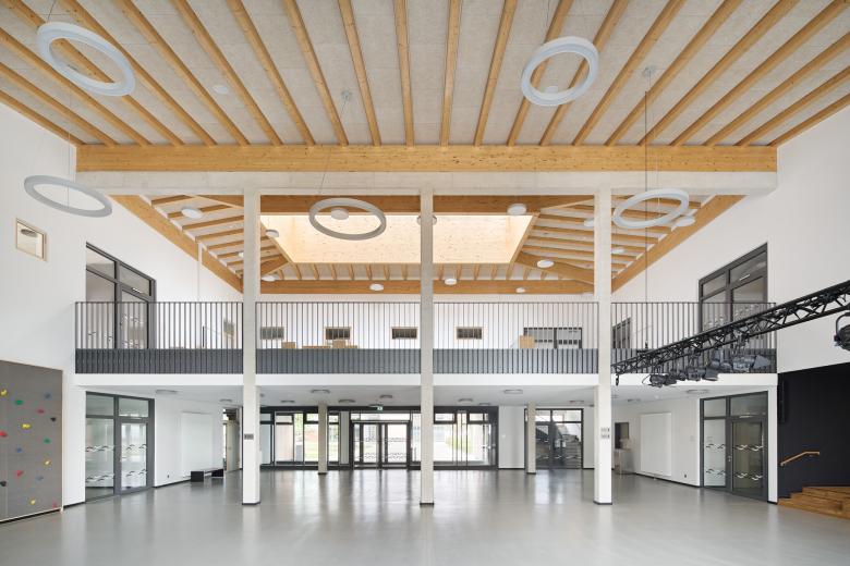 Jedes der drei Häuser wird von einem Walmdach überspannt, das von einer sichtbaren Holzkonstruktion getragen wird und durch ein Oberlicht für Helligkeit sorgt. Die robusten Fassaden aus hellem Klinkern bilden einen wohltuenden Kontrast zu den großen Fensterflächen. Eine Besonderheit ist die Mensa, die aufgrund des geringen Platzangebots in den Hang eingelassen ist und deren Dach als Schulhof dient.