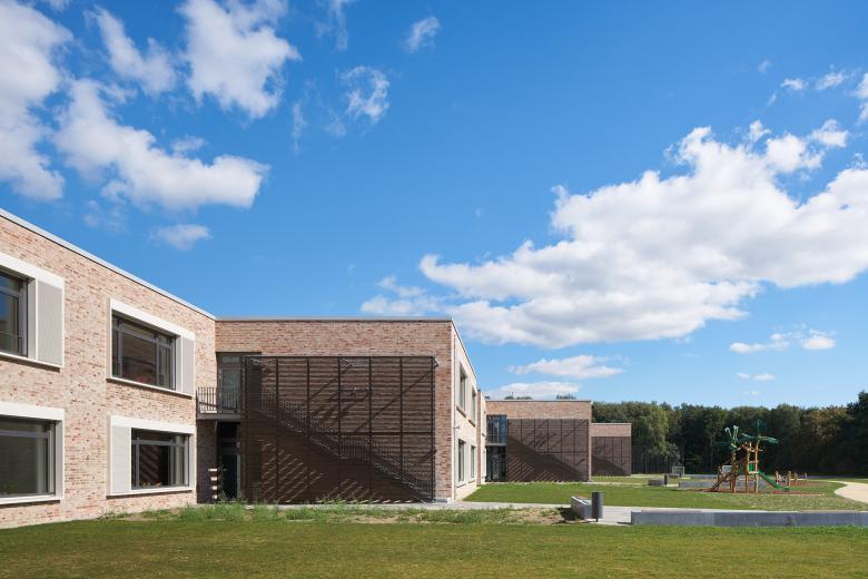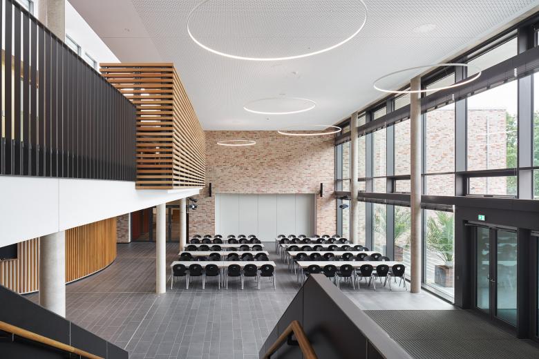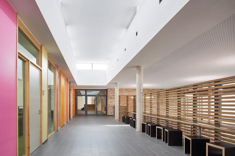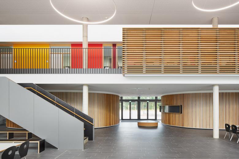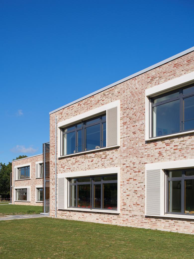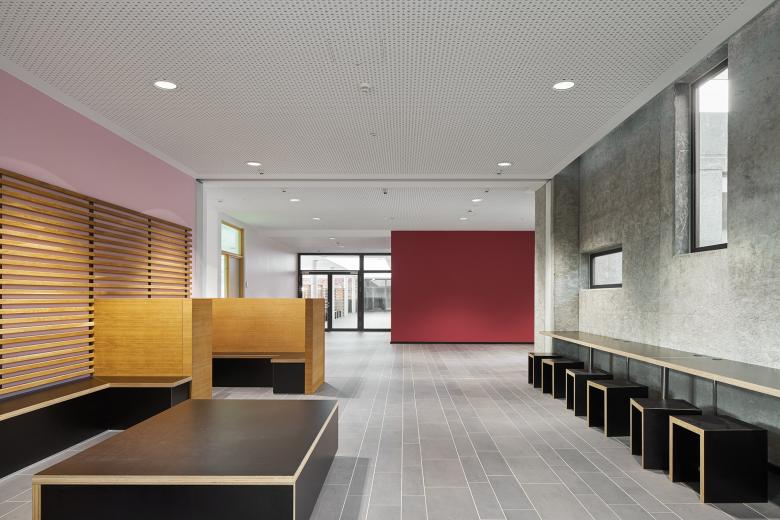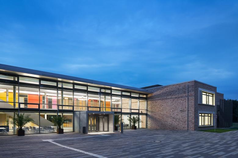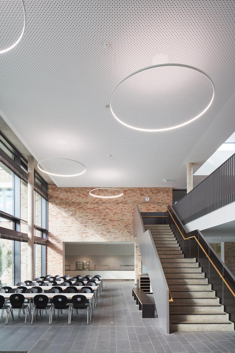 Das Gebäude definiert die Nahstelle zwischen Stadtrand und Flussaue des Steinhuder Meerbachs und nutzt die naturräumlichen Potenziale für eine dezentrale „Schule im Grünen“. Eine gläserne Aula verbindet als Mittelpunkt des Hauses die südlichen Jahrgangscluster mit dem nördlichen Bereich der Fachklassen, Verwaltung und Küche.