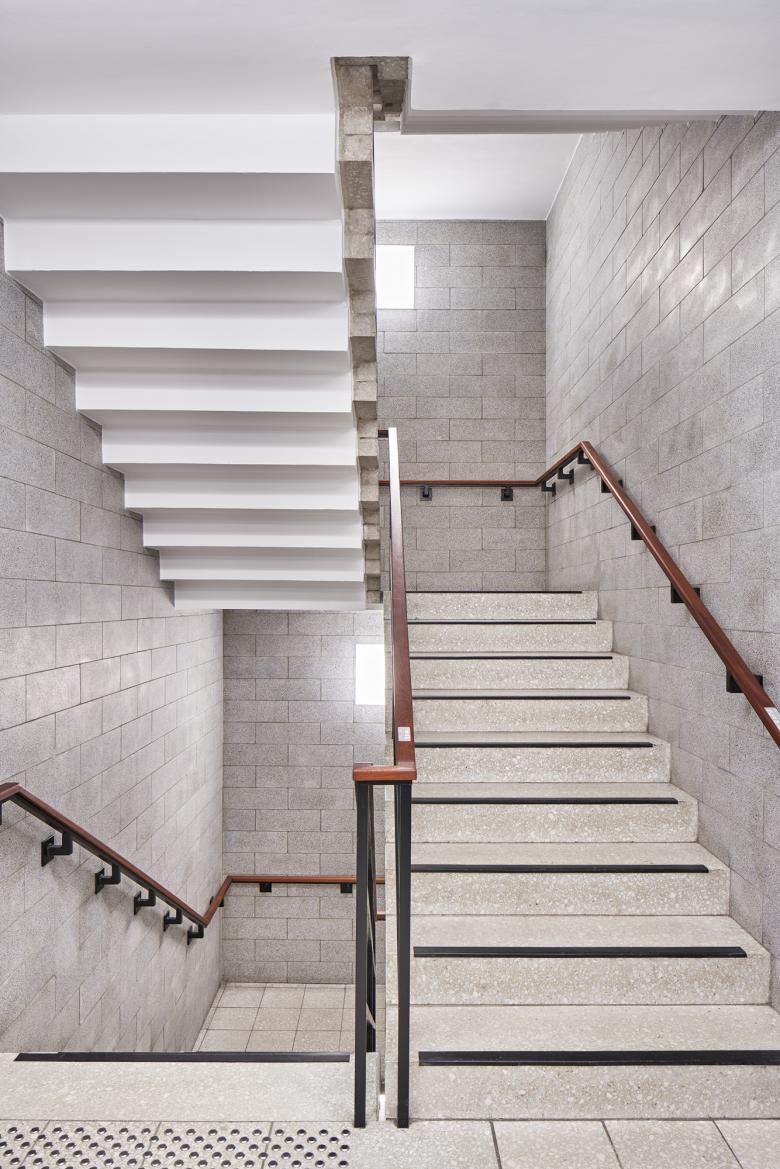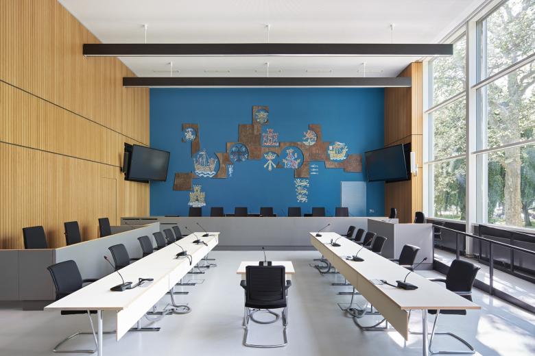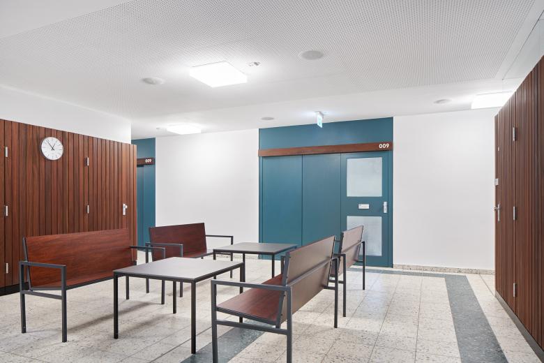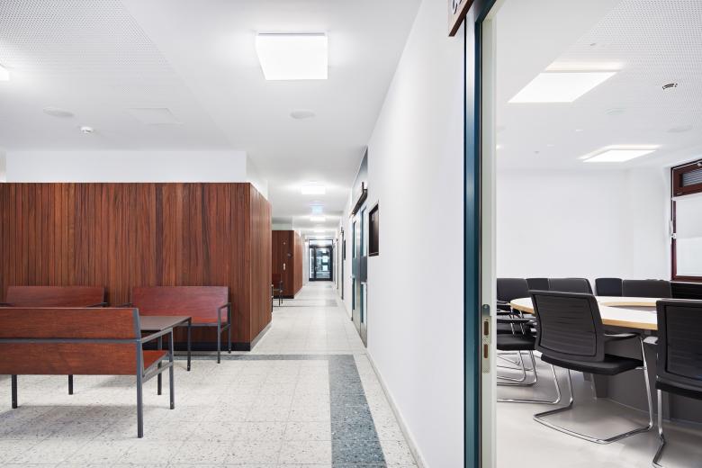 Der winkelförmige Komplex besteht aus einem dreigeschossigen Bau mit insgesamt 17 Gerichtssälen, dem großen Schwurgerichtssaal und einem achtgeschossigen Bürohochhaus mit neun Sälen und fast 200 Büros mit 310 Arbeitsplätzen. Nach einem von uns geplanten und 2009 fertiggestellten Erweiterungsneubau folgte die umfassende Sanierung des Bestandes. Heute ist das Gebäude barrierefrei erschlossen, erfüllt hohe Sicherheitsstandards sowie aktuelle Brandschutzauflagen und besitzt eine moderne Gebäudeausrüstung, beispielsweise zur Integration der digitalen Akte. Wir haben die hohen Anforderungen stets mit denkmalpflegerischen Belangen in Einklang gebracht. Trotz tiefgreifender Maßnahmen konnten wir so den Charakter bewahren: Das Land- und Amtsgericht ist nach wie vor ein Zeuge seiner Zeit, wird aber in seiner Qualität auch zukünftigen Ansprüchen gerecht werden.
