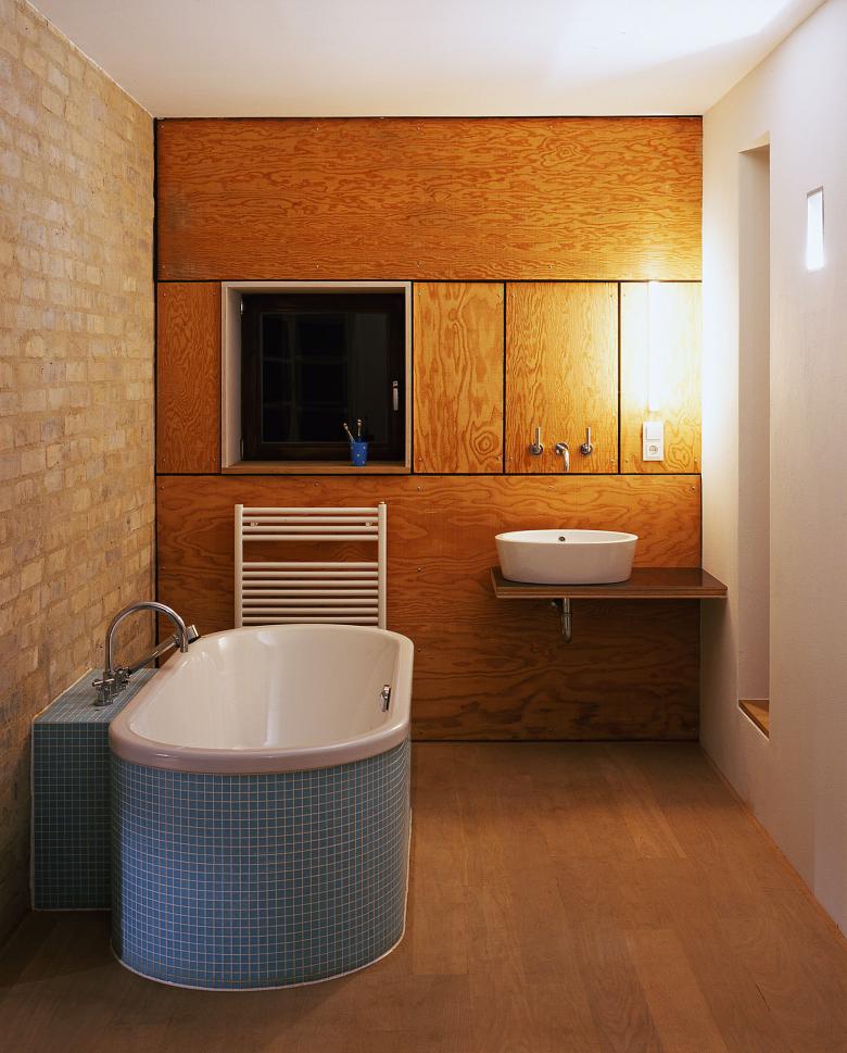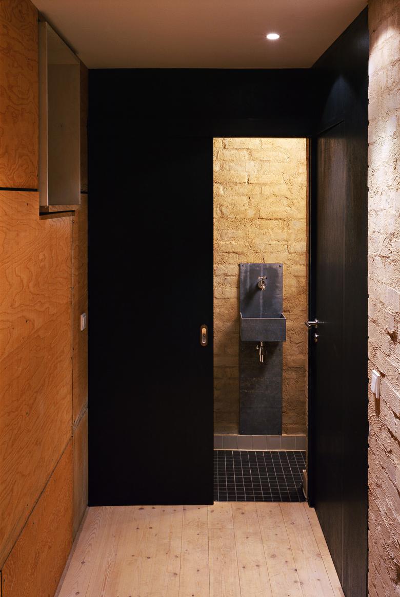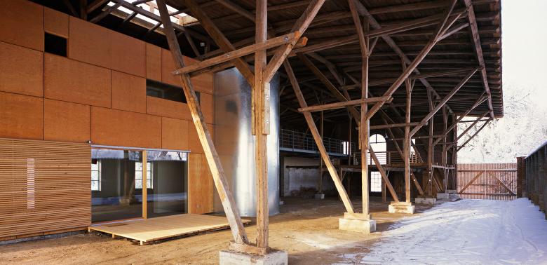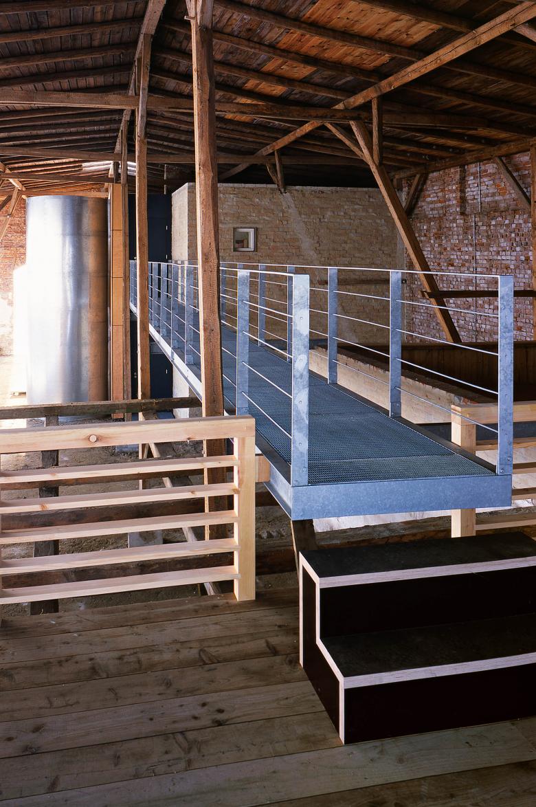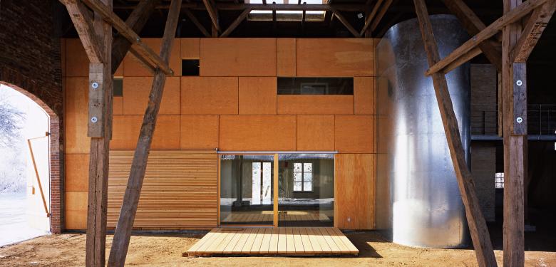 Eine zweigeschossige Sperrholzscheibe erweitert den Wohnraum und stellt erstmals eine Verbindung ins Innere der Scheune her. Durch den teilweisen Rückbau der östlichen Längsfassade entsteht ein hofartiger Außenraum. Ein eingestellter siloartiger Metallzylinder nimmt die Treppe auf. Ein Gitterroststeg führt längs durch die Scheune auf die Terrasse auf dem ehemaligen Heuboden mit Blick auf den See.