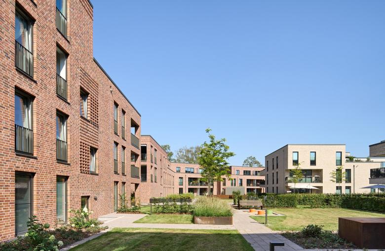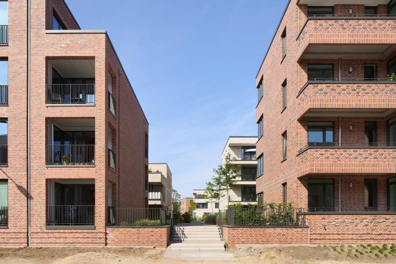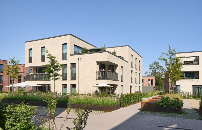 Zu Beginn der Planungen einigten sich alle Beteiligten auf einen Gestaltungsleitfaden, der Aussagen zum Städtebau, zum Freiraum, zu Baukörpern und zur Materialität umfasst. Auf dieser Basis ist ein gestalterisch ruhiges Quartier entstanden, das von der Vielfalt in der Einheit lebt, auch durch die gemeinsame Freiraumplanung. Eine durch uns geplante und mit allen Einzelentwürfen abgestimmte Tiefgarage bietet Abstellmöglichkeiten für 250 PKW und 450 Fahrräder. 25 der 87 von uns entworfenen und bis zur Fertigstellung betreuten Wohnungen wurden öffentlich gefördert. Unsere Wohnungen überzeugen durch großzügige Freisitze und Fensterflächen, optimal nutzbare Grundrisse und eine gradlinige, aber dennoch individuelle Gestaltung bis ins Detail. Gleich, ob in der geschlossenen Randbebauung oder in den freistehenden Häusern im Inneren, das Quartier bietet ein besonderes Wohnumfeld zwischen Wasser und Altstadt.