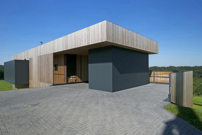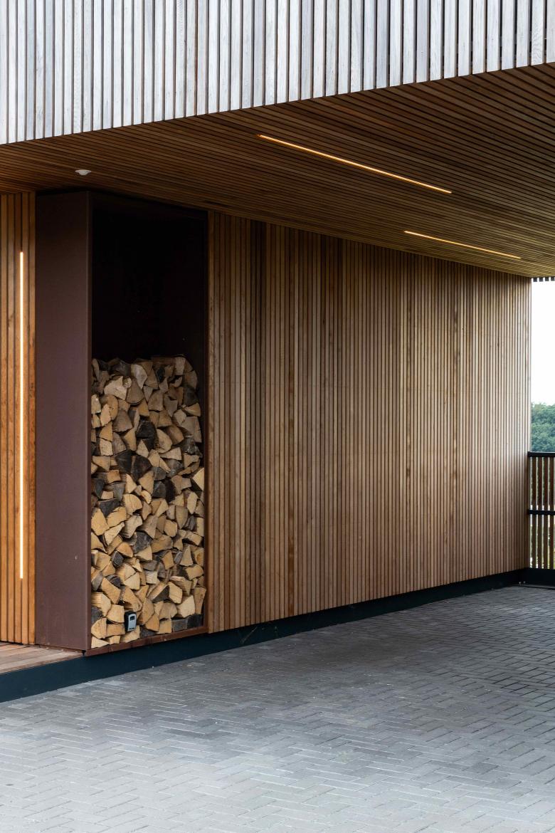 A rue elle propose ainsi une zone de carport intégrée au volume qui permet également un accompagnement, à couvert, vers la porte d’entrée. Cet aménagement est agrémenté de fonctions telles qu’un rangement extérieur et un espace de stockage de bois de chauffage qui l’animent. Cette première séquence du volume induit une mise à distance de l’espace habité par rapport au domaine public et permet aisi une première attitude d’intimisation de l’espace privé.