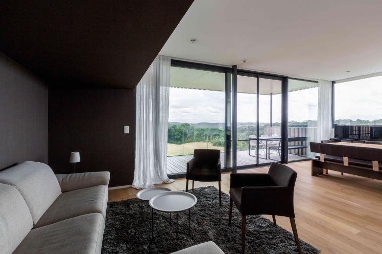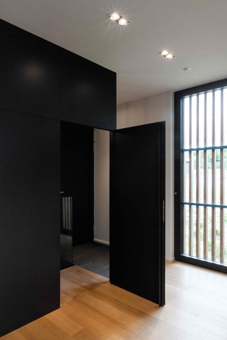Le rez-de-chaussée de l’habitat comprend les pièces de vie ainsi que la suite parentale et les espaces de « service » (buanderie, arrière-cuisine). Cette demande du maître d’ouvrage émerge d’une réflexion à long terme visant à une utilisation « autonome » de cet espace de plein pied le rendant ainsi exploitable, même pour des personnes à mobilité réduite. Les espaces s’y organisent ensuite suivant leurs caractéristiques ; la suite et les zones de service se retrouvent au départ du système, avec une attitude plutôt introvertie tandis que le séjour s’ouvre largement sur le paysage en fin de volume. Ce schéma est répété au R-1 (niveau partiellement enterré) avec les espaces techniques en terre et les chambres d’enfants orientées vers la forêt.