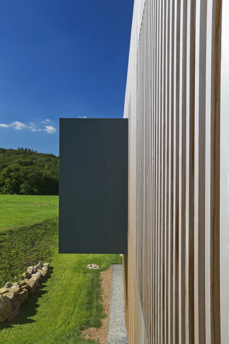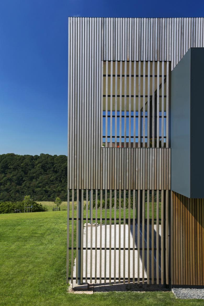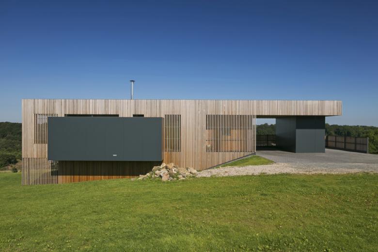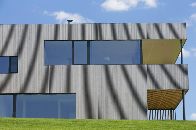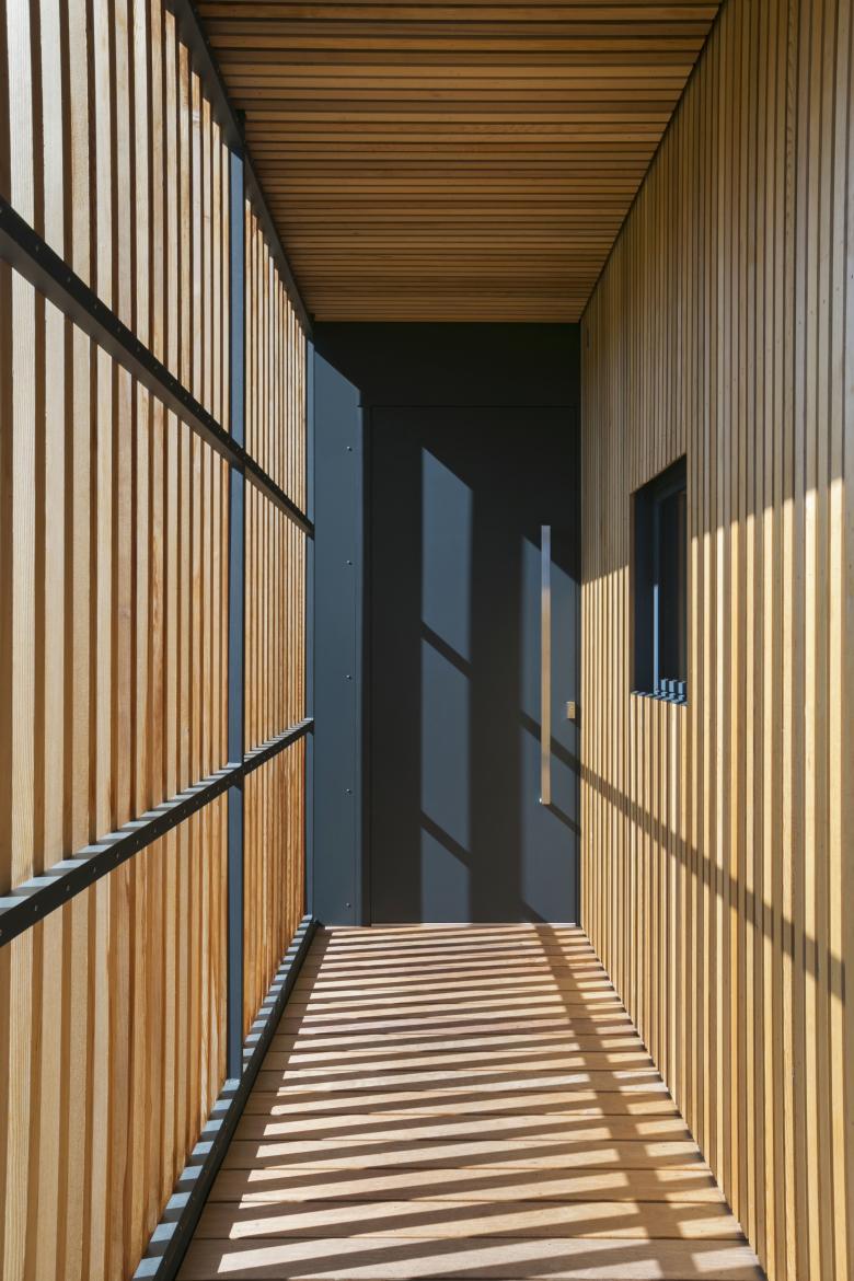 Ce principe est interprété en façade via l’utilisation du bardage vertical ajouré décliné en fonction des espaces bardés. Ainsi, au plus proche de l’espace public ou en vis-à-vis des propriétés voisines, le bardage recouvre les baies et fait office de filtre visuel. Aux endroits spécifiques, les bois de bardage présentent même une section adaptée permettant l’annulation des regards indiscrets en oblique. Lorsque le contexte le permet, le bardage laisse place à de larges baies vitrées. Cette adaptation d’un seul et même matériau permet une lecture homogène du volume, ce qui simplifie et renforce sa morphologie particulière.