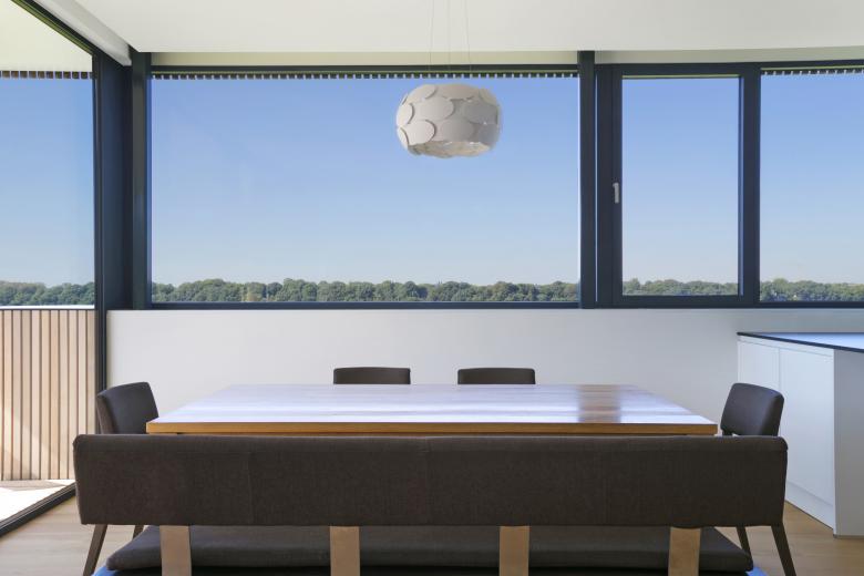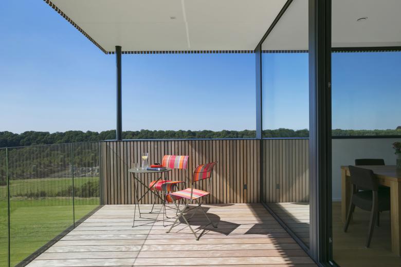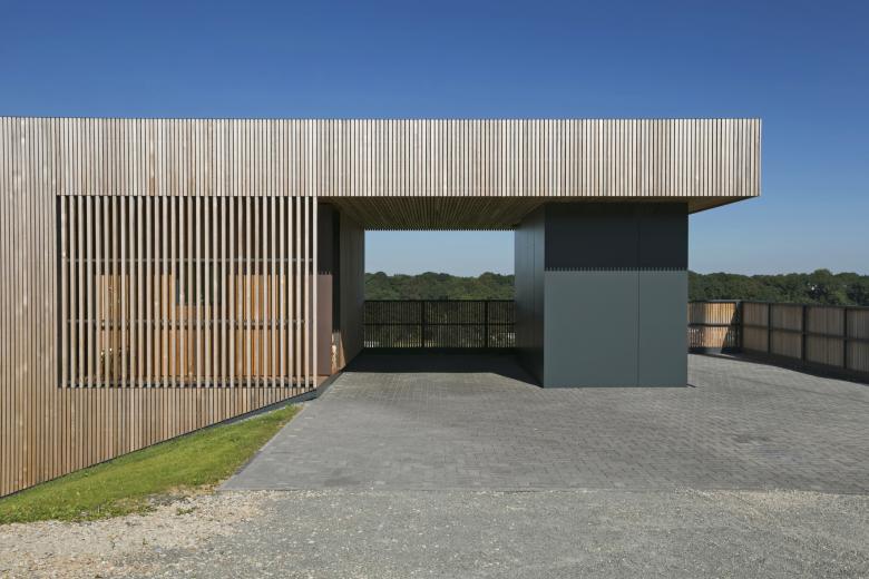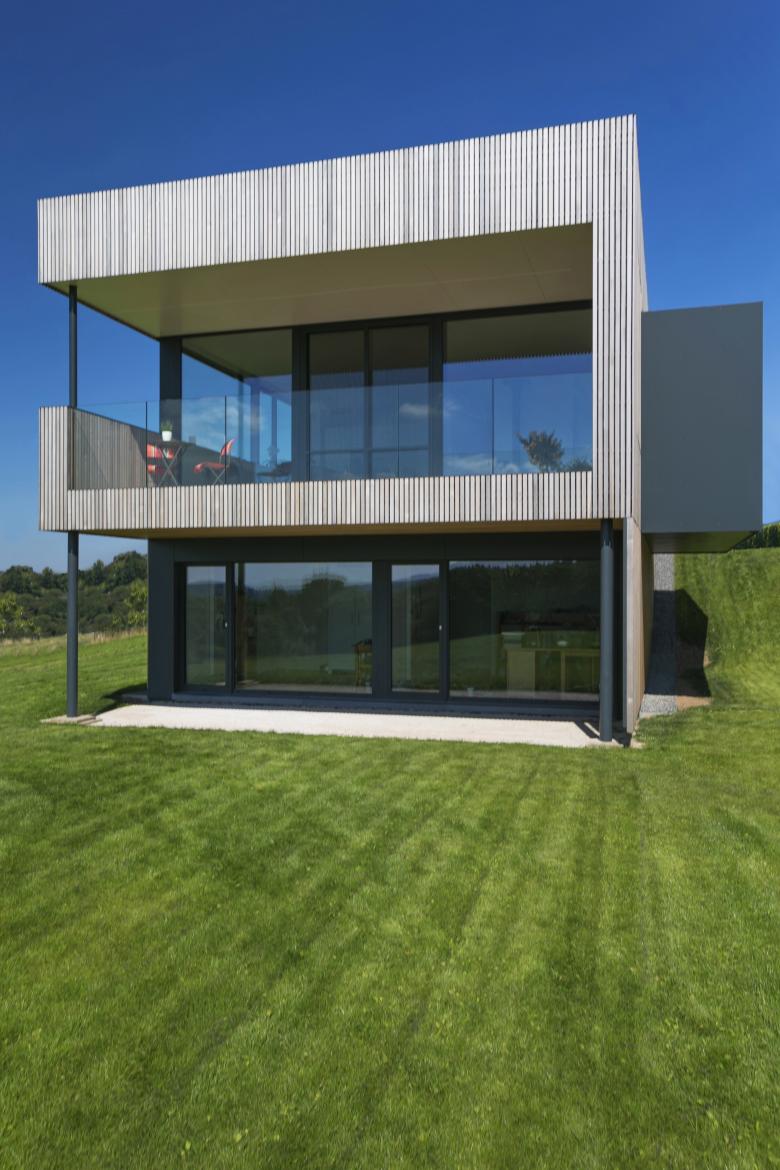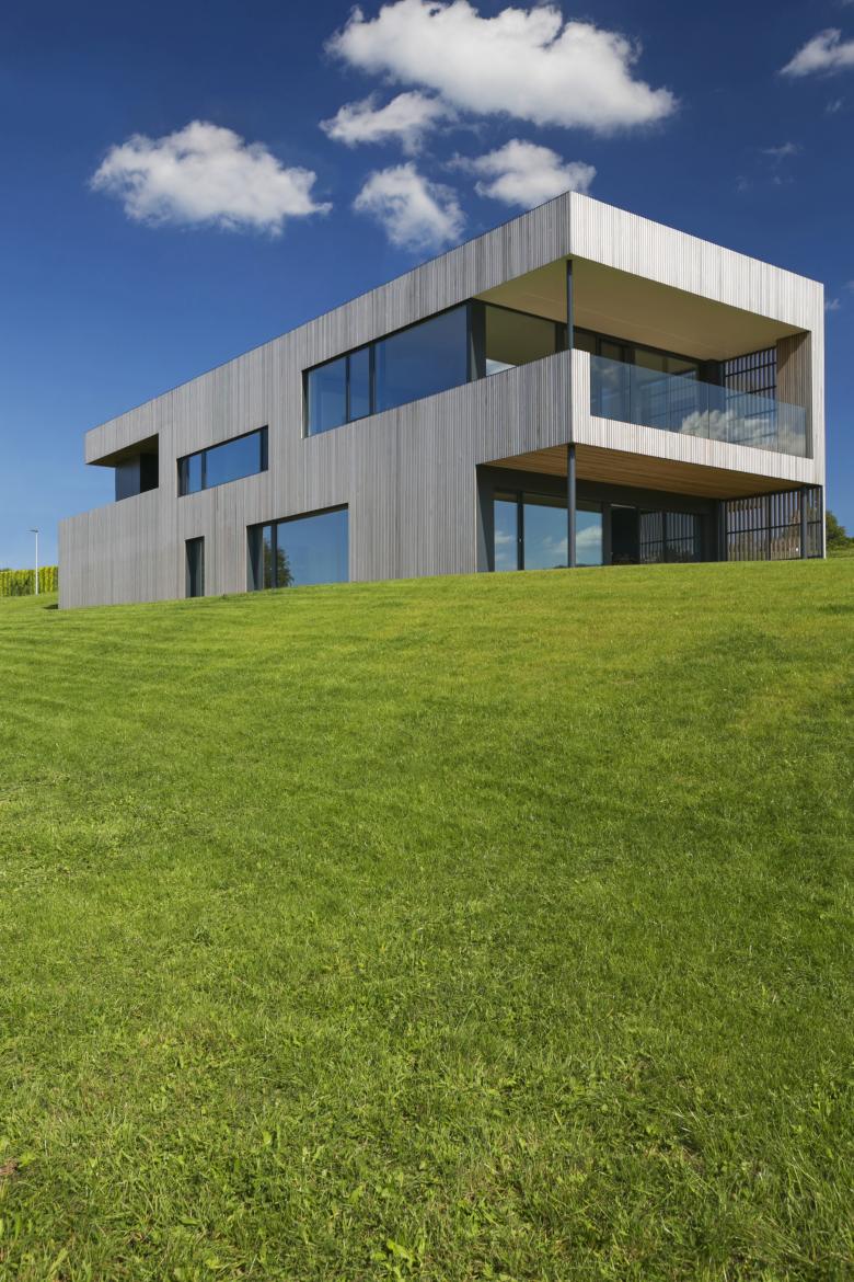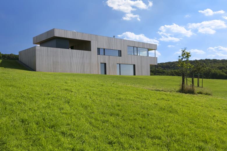 Ce principe est interprété en façade via l’utilisation du bardage vertical ajouré décliné en fonction des espaces bardés. Ainsi, au plus proche de l’espace public ou en vis-à-vis des propriétés voisines, le bardage recouvre les baies et fait office de filtre visuel. Aux endroits spécifiques, les bois de bardage présentent même une section adaptée permettant l’annulation des regards indiscrets en oblique. Lorsque le contexte le permet, le bardage laisse place à de larges baies vitrées. Cette adaptation d’un seul et même matériau permet une lecture homogène du volume, ce qui simplifie et renforce sa morphologie particulière.