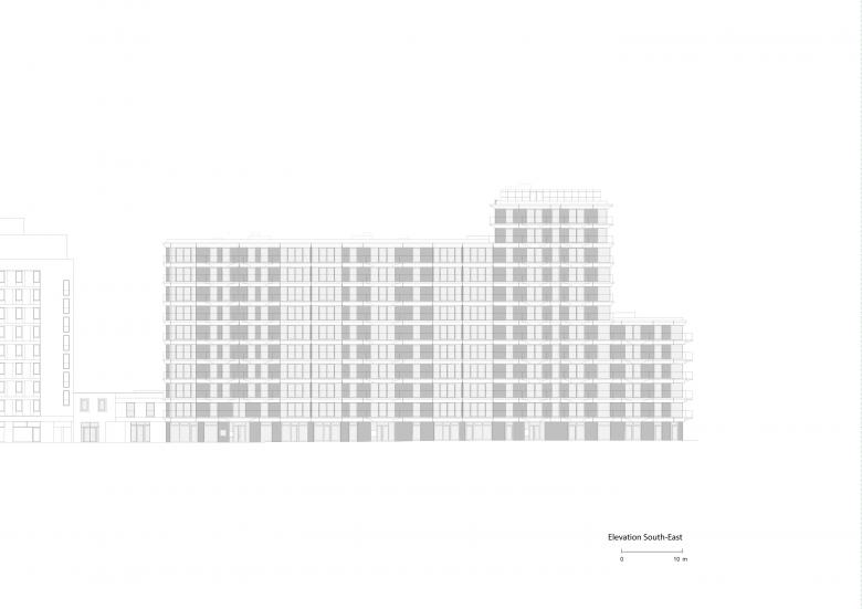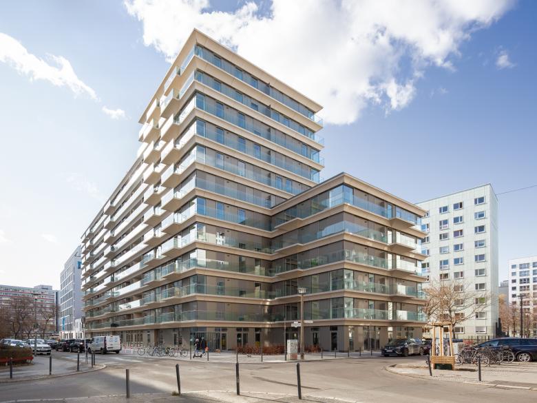 Der Wohnkomplex besteht aus einem zehngeschossigen Riegel, dessen Kopf mit zwei weiteren Geschossen turmartig markiert wird. Ein sechsgeschossiger, versetzt angefügter Vorbau führt die Traufhöhe auf das historische Berliner Maß zurück und flankiert an der Barnimstraße die Zufahrt zu einem gemeinsamen Innenhof. Am anderen Ende binden das Erd- und das Obergeschoss den Komplex an den Nachbar an. Außer den Gewerbeeinheiten im Erdgeschoss entstanden hier ausschließlich Wohnungen.