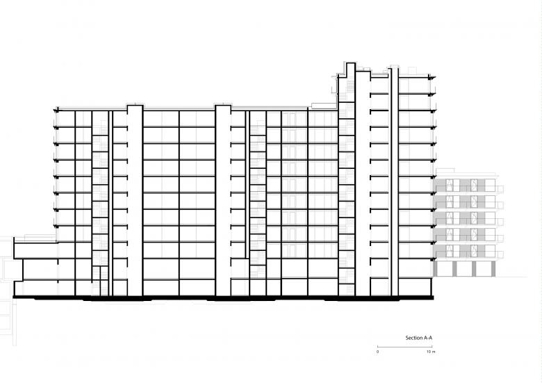 Eine eingeschossige Tiefgarage im Untergeschoss bietet Raum für 41 PKW-Stellplätze, einige davon barrierefrei. Insgesamt wurden für das Gebäude auch 240 Stellplätze für Fahrräder vorgesehen, die sich in den Fahrradräumen im Unter- und Erdgeschoss und oder in den Freianlagen im Hof befinden.