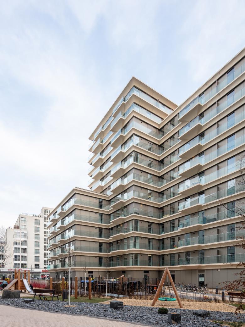 Ungeachtet seiner großen Dimensionen präsentiert sich das Gebäude leicht und offen durch die raumhohen, großzügigen Fensterfronten und einem offen gestalteten, flächig verglasten Erdgeschoss. Die aus gefärbtem Architekturbeton aufwendig gestalteten, voutenartigen Gesimsbänder bilden eine fließende Linie mit den Balkonen, Loggien und bodentiefen Fenstern und verleihen der Fassadenmatrix zusätzlich Plastizität und Spannung. Unterstützt wird die horizontale Betonung durch die schmalen durchgehenden Brüstungen, die dem Volumen gemeinsam mit dem Rhythmus transparenter und opaker Glaselemente einen unverwechselbaren Charakter verleihen.