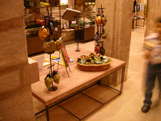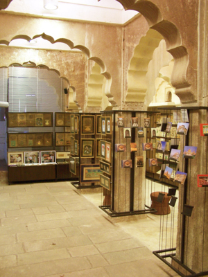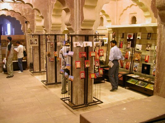 Special pressure clamps were developed for Post card & book display around the existing stone columns that hold the entire display in place without any structural elements damaging the old structure. All design was done keeping in mind that not a single hole is drilled in the walls or the ceiling. All light fixtures were mounted on expanding pressure rods with rubber mounting on either side that stayed in place using pressure. Lighting was a combination of accent lighting accentuating the architecture and product lighting-all lamps being energy saving fixtures-keeping in mind the power shortage in the area.