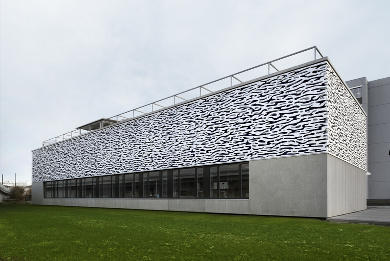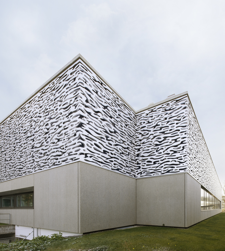 Wir beabsichtigten, den bestehenden Bau mit dem Neubau zu einem Ganzen zu formen und entwarfen eine das ganze Gebäude umfassende vorgehängte Fassade, die das Bild eine sich bewegende Wasseroberfläche eines Sees wiedergibt.