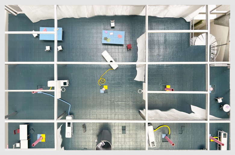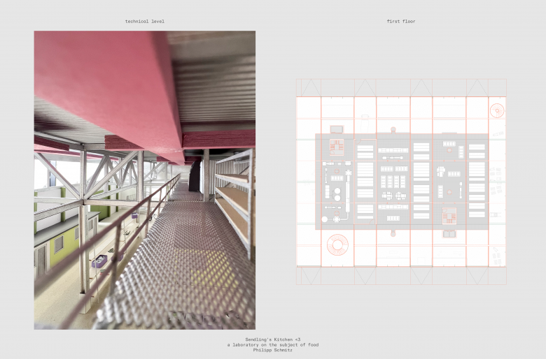 The technical infrastructure is created by a technical level that is 'inserted' between the two public floors and supplies them centrally. Food can be transported upwards from the market using dumbwaiters. In the centre of each unit, which is marked by four supports, there is a supply interface. Any medium such as water, electricity or gas can be controlled directly from here and brought to the desired position. The resulting space does not dictate any configuration and is directly shaped and characterised by the various users and their behaviour. The result is a space that allows new processes to be tested in an experimental environment.