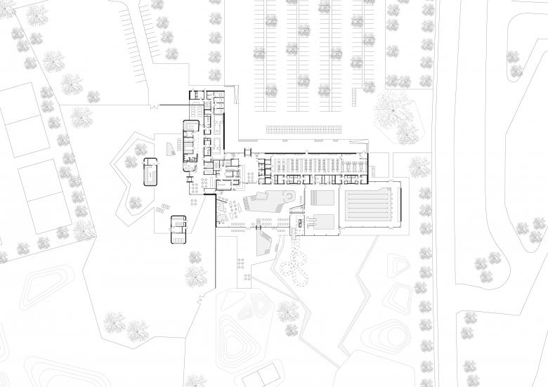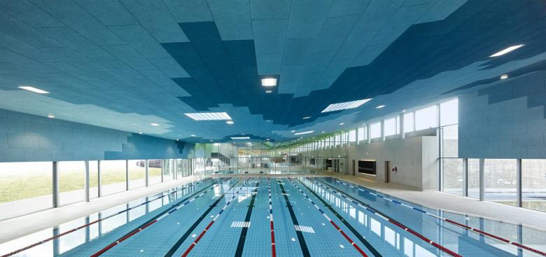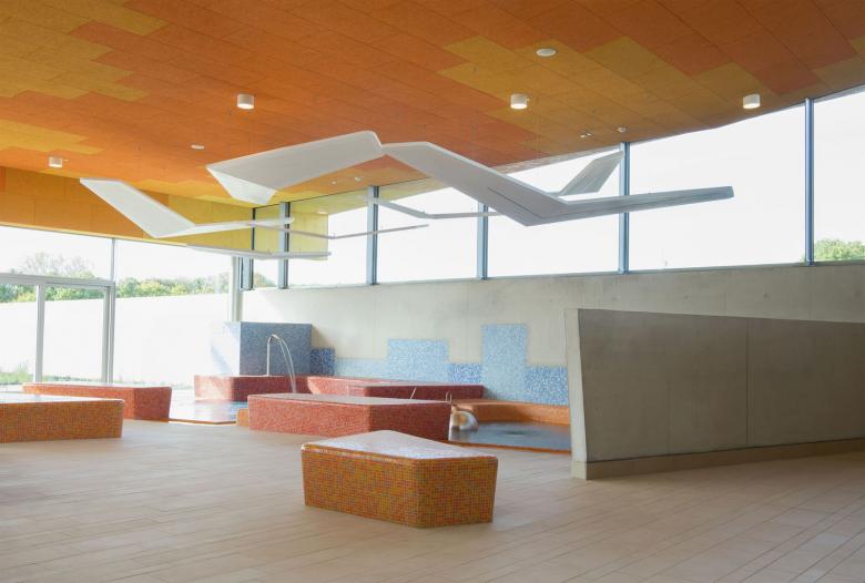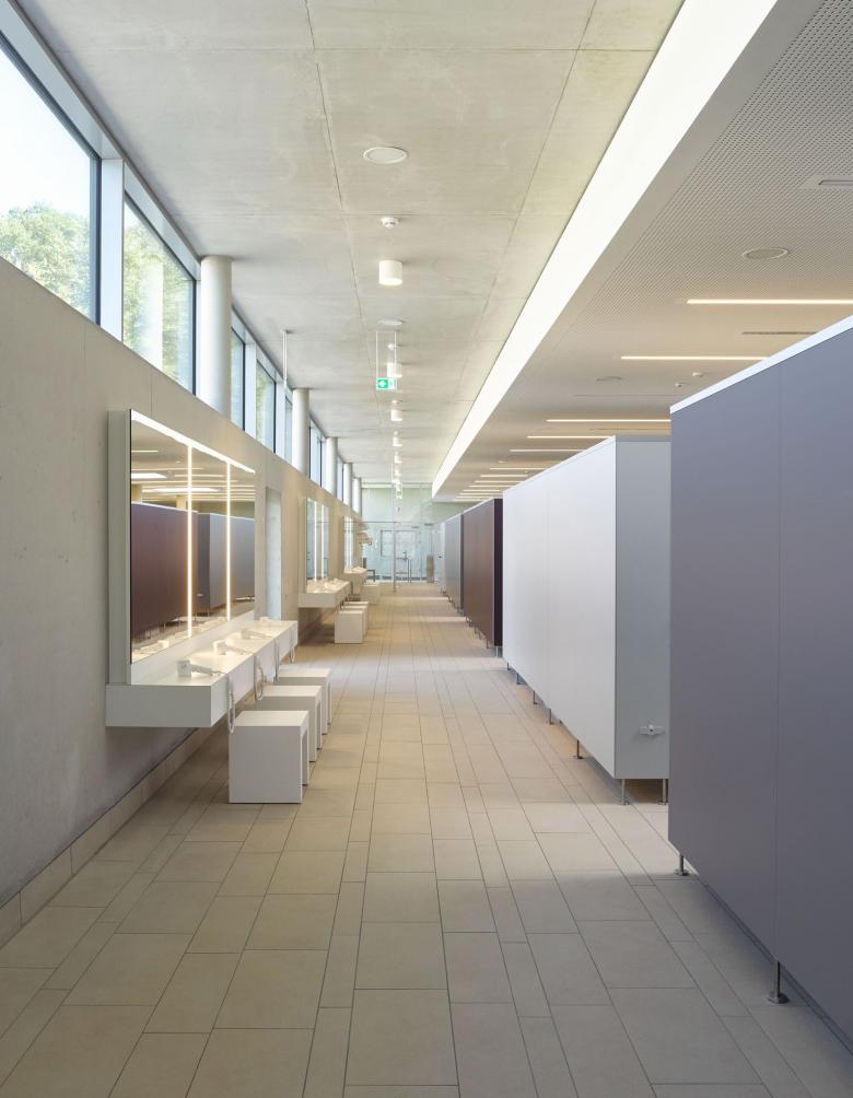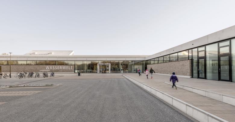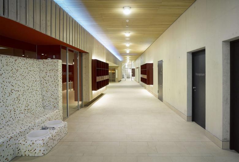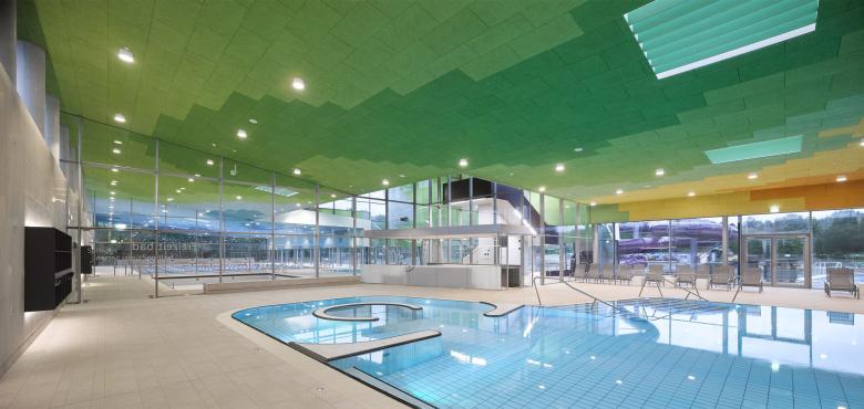 Das Bad ist entsprechend den Funktionen „Sport, Freizeit und Sauna“ in drei Baukörper gegliedert. Eine zurückversetzte Sanitär- und Umkleidespange verbindet die Bereiche miteinander. Diese Struktur ermöglicht den Parallelbetrieb zwischen Schulen bzw. Vereinen und Öffentlichkeit sowie die separate Nutzung des Saunabereichs. Formal und gestalterisch unterscheiden sich die drei Bereiche entsprechend ihrer Nutzung: ein funktional strukturierter Sportbereich, optimal organisiert mit zurückhaltender Architektur; ein erlebnisorientierter Freizeitbereich mit Wasserattraktionen, Rutschenturm, Kinderbereich, Gastronomie und Liegeflächen auf zwei Ebenen; ein erholsamer Sauna- und Spabereich mit mehreren Saunen, Abkühlbereichen und verschiedenen Anwendungen. Unterschiedliche Oberflächen, warme Farbtöne, Nischen sowie Lichteffekte laden den Gast zum Entspannen und Entdecken ein.
