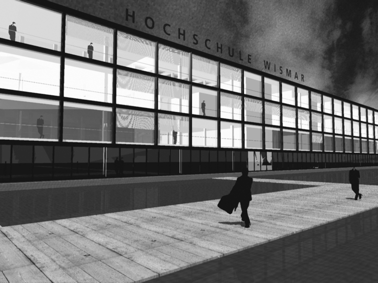 Mit dem neuen Fachbereichsgebäude für Architektur und Innenarchitektur/Design wird ein weiterer Domino-Stein in die bestehende Anlage eingefügt. Die Kompaktheit und Grösse des Volumens generiert dabei eine für den neuen Hochschulstandort Wismar in Massstab und Bedeutung angemessene Erscheinung. Die Breitseite des langen Baukörpers stellt sich der Tiefe der Lübschen Torweide entgegen und vermittelt als Botschafter der Hochschule über die Landschaftsbrücke hinweg zur Mutterstadt Wismar. Mit der schmalen Eingangsseite stösst der Baukörper an die neu geschaffene Plattform, die ihrerseits an alle zentralen Bauten anschliesst und deshalb das Aussenraumforum der Hochschule bildet.