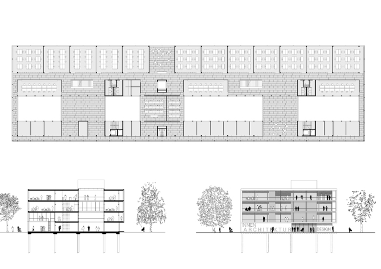 Das Projekt wird aus dem Programm der Fachhochschule entwickelt, worin die drei Elemente Lehre + Forschung, Studium + Arbeit, Kommunikation + Wissensvermittlung als thematische Nutzungsgruppen erkannt und in drei linearen Gebäudezonen eingebunden werden, die aber mit eigenen Wegführungen separat zugänglich bleiben.