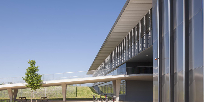 La figure horizontale du bâtiment, renforcée par la ligne de l’avant toit, se projette sur le paysage, contrastant avec les ondulations naturelles du terrain. Cette horizontalité est accentuée par l’axe de la « Promenade des Alpes » aménagée par l’Atelier du Paysage, composée d’un bassin en pierre naturelle qui longe la promenade, et qui se prolonge par une généreuse rampe conduisant à l’entrée principale. Cette promenade joue le rôle de véritable colonne vertébrale paysagère structurant l’ensemble du site.