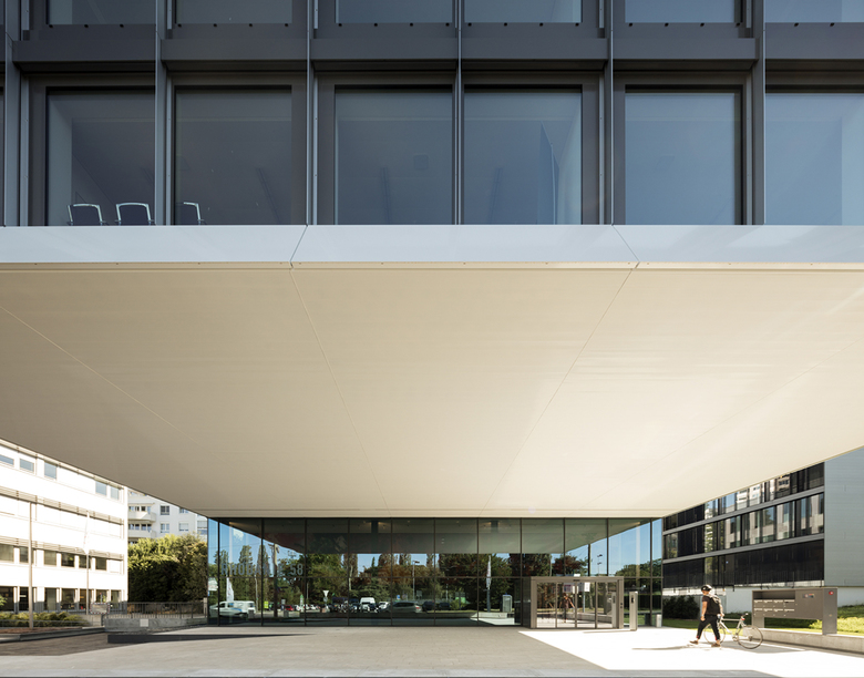 The 18-metre, two-storey cantilever (overhang) was negotiated with the urban planning department when the district plan was drawn up. It gives Rhodanie 58 a rather distinct identity and scenescapes the entrance forecourt. The static, structural concept was developed hand-in-hand with Ingeni, structural engineering company in Lausanne. This cantilever required, of course, a complex structure with two large Vierendeel beams installed on the lateral facades which are then supported by a central reinforced concrete nucleus. This nucleus groups together the building’s vertical circulations as well as its technical installations and services. Moreover, its heart is hollowed out to give way to a spacious atrium which lets natural daylight enter down to the lower floors. This construction concept enabled us to leave large open spaces totally free from pillars thus offering optimal flexibility for creating office spaces.