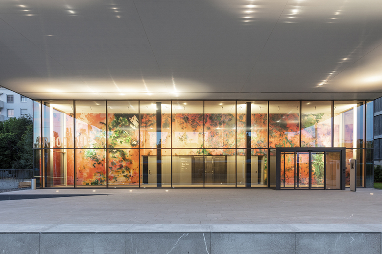 More especially at night-time, the building’s cantilever showcases the spectacular, over 100 m2 wall of the lobby. Very early on, and in agreement with the client, we imagined how we could highlight this space. At night-time, the indirect ceiling lighting gives the impression that the front part of the building is actually levitating and offers perfect visibility for hosting major artistic creations. We had the great pleasure to organize a competition with 5 young Western-Swiss artists and Maya Rochat’s works were selected and installed in the lobby and those of Anouchka Perez in the atrium. This concept could be renewed every other year and would be a way of perceiving the building in a new light whilst promoting the creativity of young artists from Western Switzerland.