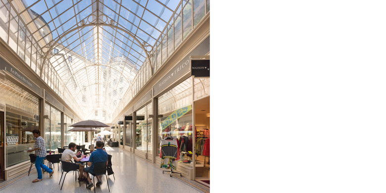 Dans un ensemble aux qualités techniques, architecturales, historiques et patrimoniales disparates, le projet offre un éventail complet de types et de niveaux d’intervention : un bâtiment est supprimé, un immeuble est démoli et reconstruit, dans le palais bancaire les façades sont maintenues alors que les dalles existantes, fragilisées par des interventions successives, sont reconstruites, deux bâtiments sont rénovés (changement des fenêtres, isolation des façades et rénovation intérieure), alors que pour le Passage des Lions, l’intervention cherche à préserver le maximum de substance de la construction initiale et à restaurer dans l’esprit d’origine les éléments remplacés.