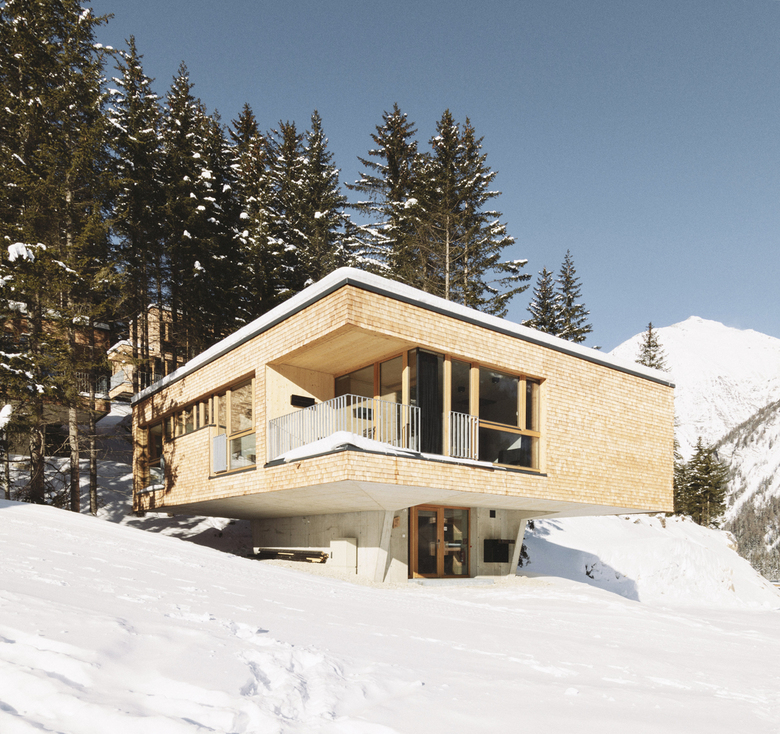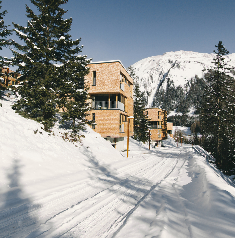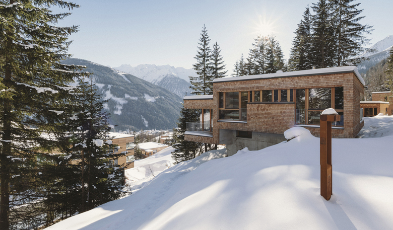 Die Chalets sind als kubische, auf die Hangneigung reagierende Formen, auf einem pilzförmigen Betonsockel konzipiert. Sie bestehen vollständig aus massivem Brettsperrholz, bekleidet mit einer Schindelfassade, lärchenrot, später die Farbe des Waldes annehmend.