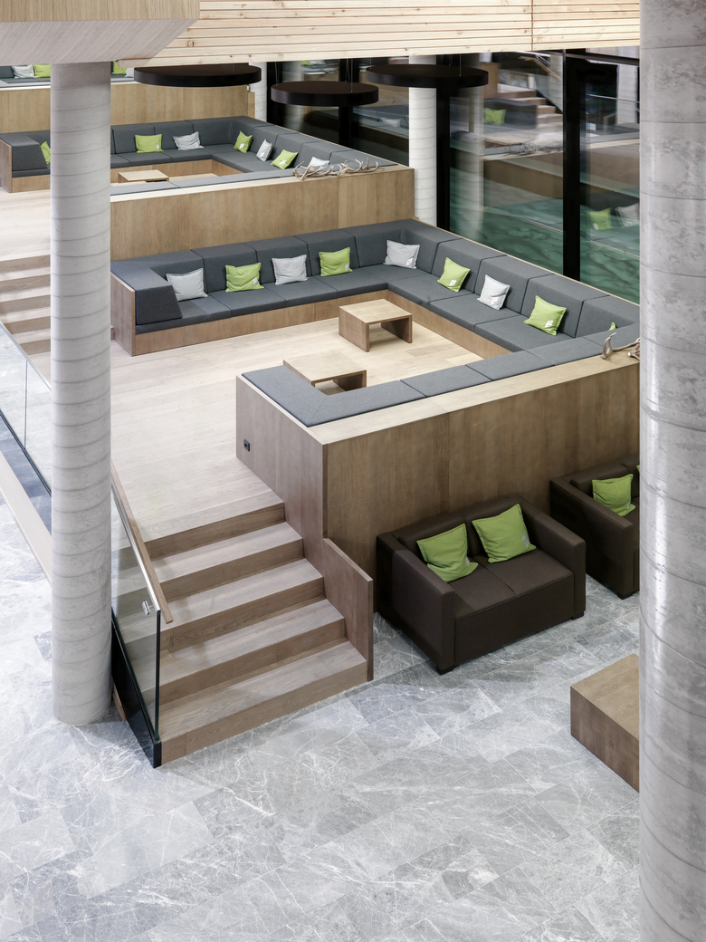 Auf diesem Sockel sitzt der hölzerne Zimmertrakt mit 117 Zimmern. 12 Suiten im Turm - als Zentrum der Anlage weithin sichtbar - ergänzen das Bettenangebot. Um eine teilweise 3-geschossige Empfangshalle gruppieren sich Bar, Seminar-bereich, Speisesaal und Restaurant mit großer Terrasse, Geschäfte für den