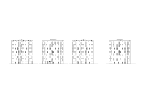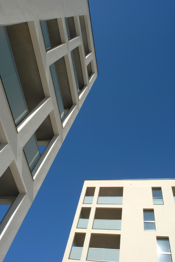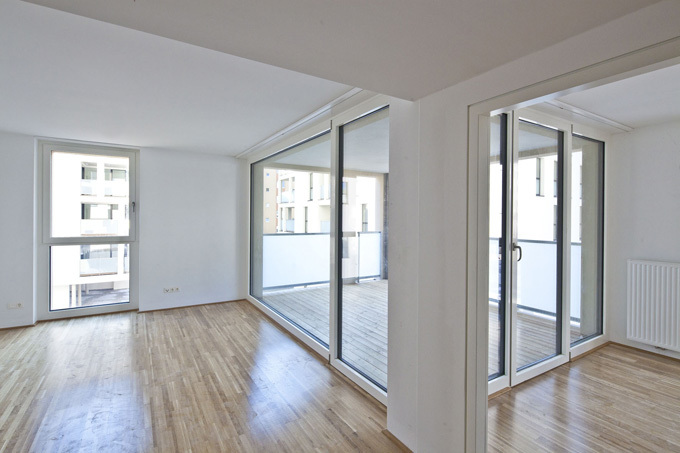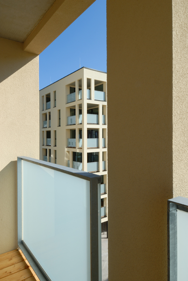 Diese Binnenlage wird durch das von den Architekten vorgelegte Grünraumkonzept gestärkt: ein dichter Rand aus Bäumen, die Mitte frei – locker und niedrig bepflanzt. Sitzgelegenheiten, Pavillons und Pergolen markieren strategisch wichtige Plätze. Eingefasste Spielplätze sowie Lichtbrunnen für die Tiefgarage mit ihren 509 Stellplätzen, bilden die Mikrostruktur. Die Fassaden der Neubauten präsentieren sich in hochwertigem WDVS und elfenbeinfarbenen Putz. Dominiert werden sie von gleich großen Fenstertüren und eingezogenen Eckloggien, die nach zwei Himmelsrichtungen Ausblick bieten. Diese Eckloggien vergrößern den Innenraum und bringen Licht in die Wohnung. Gleiches gilt für die Mittelloggien der Zwei-Zimmer-Einheiten. Zusätzlichen Platzgewinn ermöglichen Wohnküchen.