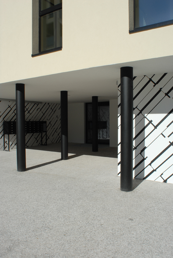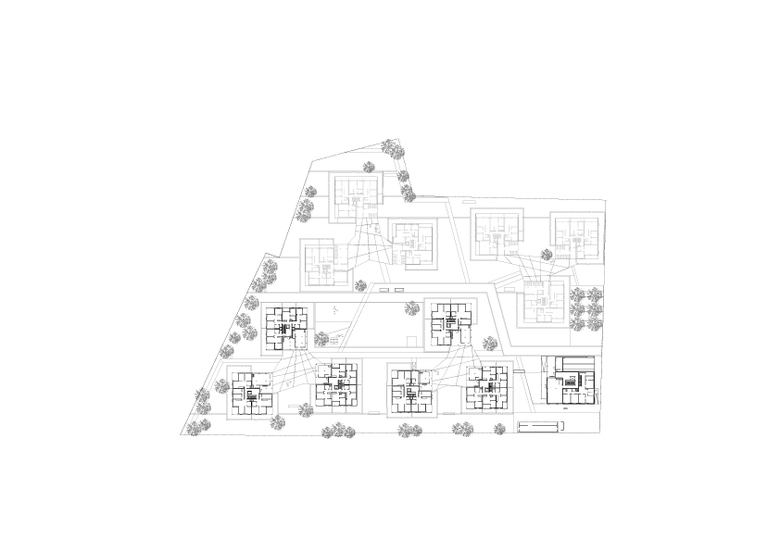 Das von ihnen eingereichte Wettbewerbsprojekt geht von einer sechs- bis achtgeschossigen Bebauung in nicht überstrapazierter Dichte und umgeben von großzügigem Freiraum aus. Um eine überschaubare Struktur zu erreichen, schlagen die Architekten insgesamt vier Baugruppen zu je drei Häuser mit jeweils etwa 30 Wohneinheiten sowie ein weiteres Gebäude vom Sondertypus „Seniorenwohnungen“ vor, das auch die Polizeistation Reichenau aufnehmen soll. Vorgelagert ist den insgesamt 13 quaderförmigen Baukörpern ein gemeinsamer Vorplatz. Alle Volumina sind in der Höhe versetzt angeordnet, um so eine gegenseitige Verschattung gering zu halten. Dabei sind die kompakten Baukörper um 45° aus der Südrichtung gedreht. Auf diese Weise wurden ausschließlich nordorientierte Wohnungen vermieden. An den Gebäudeecken schneiden Terrassen in die Baukörper ein, die von der thermischen Hülle komplett entkoppelt werden. Die Dreihäuser-Nachbarschaften versammeln sich um unterschiedlich große Höfe mit abgestuften Graden der Öffentlichkeit, die an den verschiedenen Oberflächen, Texturen und Raumfolgen ablesbar sind. Die General-Eccher-Straße weitet sich zu einem Entree-Platz aus mit der Polizei als öffentliche Einrichtung in der Nordostecke. In Richtung Südwesten schließen sich drei mittelgroße, halböffentliche Gemeinschaftsbereiche an.