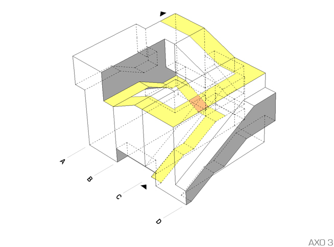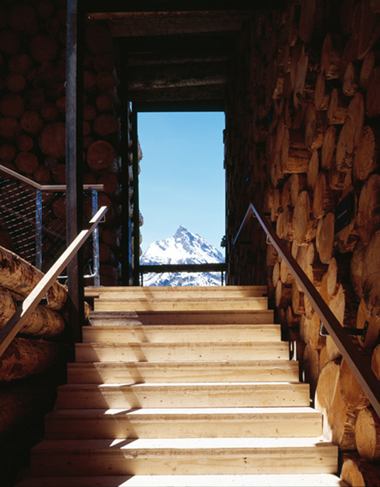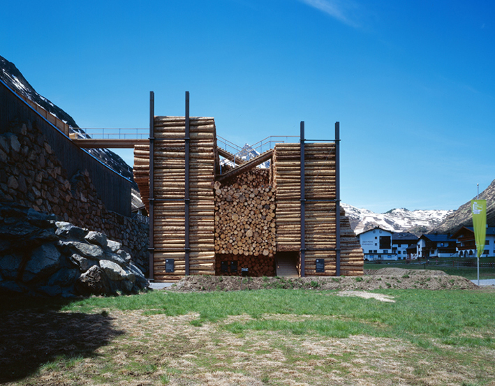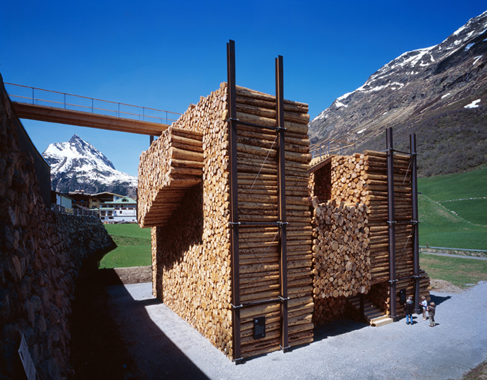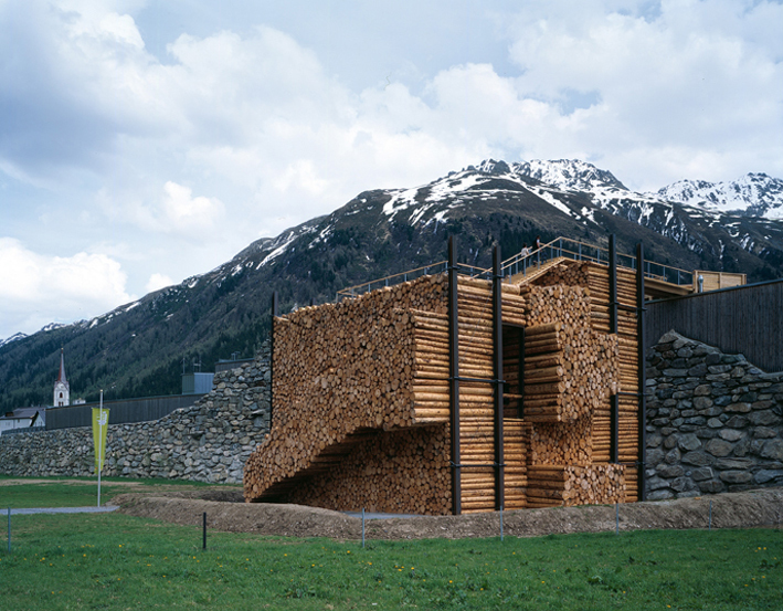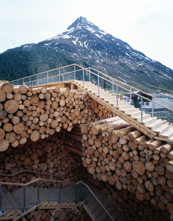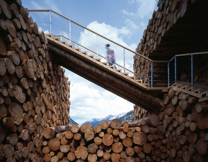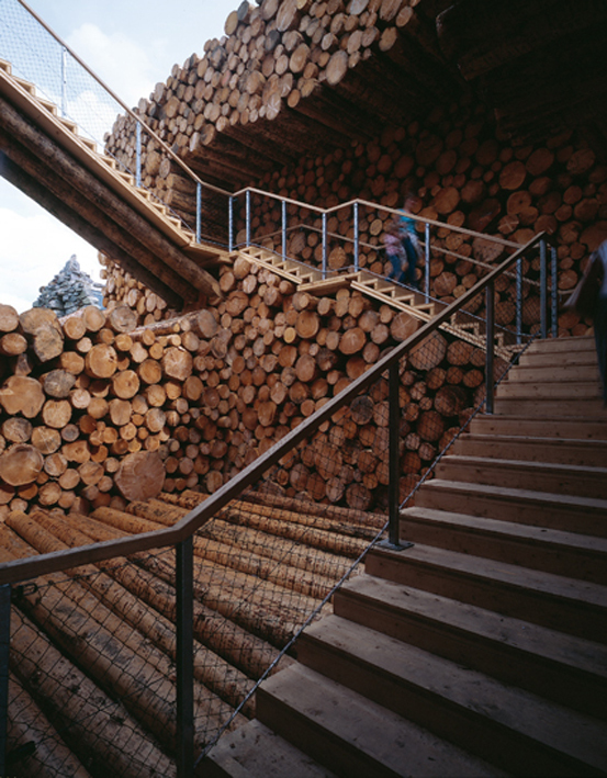 Der Besucher wird fürs erste mit roher, mächtiger Masse, 2500 m3 Holz in einer nicht sofort lesbaren Form konfrontiert. Kein Gebäude, keine Treppe; ein Würfel mit 15 m Seitenlänge aus gestapelten Baumstämmen, mit 14 m deutlich höher als man es aus den Lagerplätzen der Sägewerke kennt. Die Bewegung der Besucher bahnt sich einen Weg. Die Raumsequenzen werden nicht herausgeschnitten sondern durch Verschieben der Baumstämme erzeugt. So zeichnen sich die Innenräume als außen sichtbare Volumina ab.