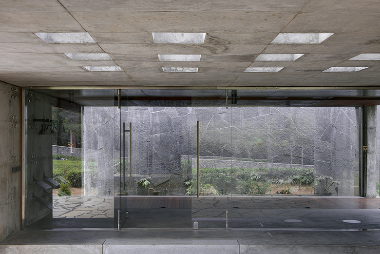 Set in a tea plantation, the house was designed to minimize the impact of its footprint on the landscape. Several inexpensive mock-ups were used to determine the optimum location both from the perspective minimizing impact as well as the framing of potential views. The house is covered in a cantilevered metal roof that floats above the verandah and reflects the tea garden below. A form-finished concrete tube forms the central circulation spine for the house, with interior spaces finished in richly textured natural wood.