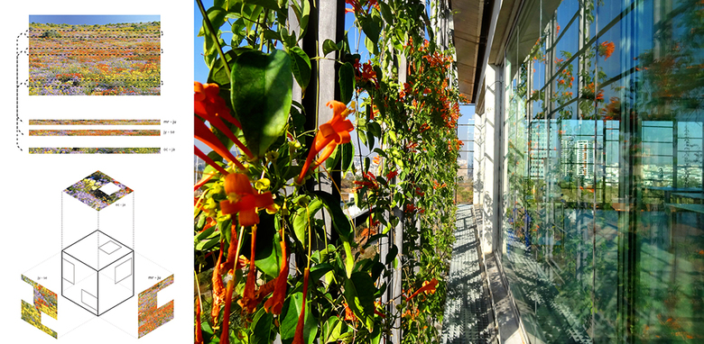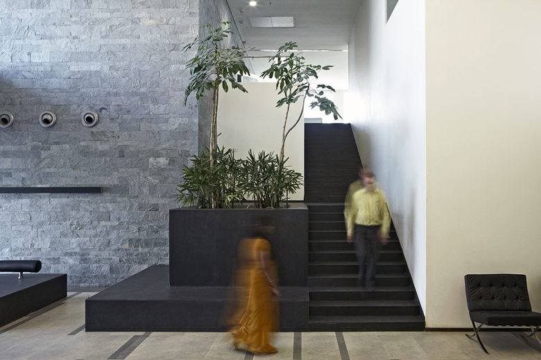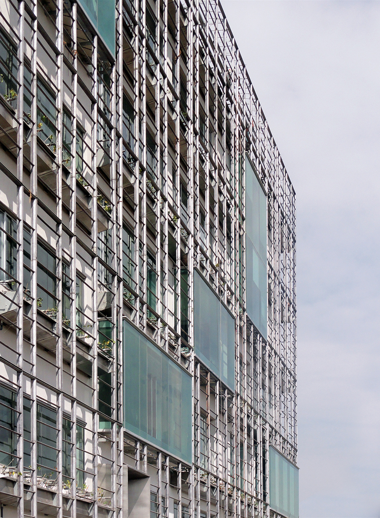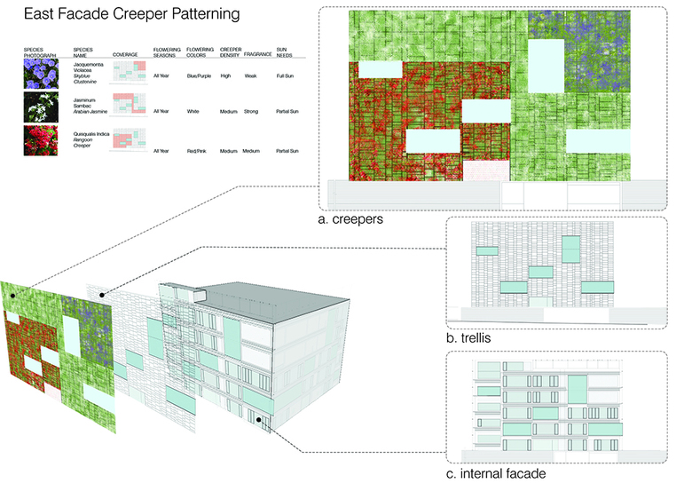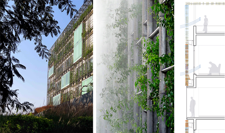 Located in Cyber City, Hyderabad, the corporate buildings employ the idea of a double skin as an energy saving and visually striking mechanism. The inner skin of the building is a reinforced concrete frame with commonly used aluminum windows. The outer façade comprises of a custom cast aluminum trellis with hydroponic trays integrated for growing a variety of plant species. The trellis also has an integrated misting system in order to control and regulate the amount of water released to the plants and trays. The principal of the facade is inspired by the idea of a double-skin that allows a modulation of light and air through the building. This is in contrast to the business-as-usual idea of the ‘greenwall’, which is a simple application on a surface purely serving an aesthetic, rather than performative function. In this project, the screen also takes on an aesthetic function of a dynamic façade where assorted species are organized in a way to create patterns, as well as bloom at various times of the year, bringing attention to different parts of the building façade through the changing seasons.