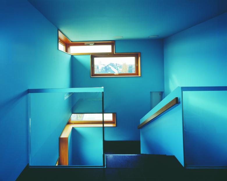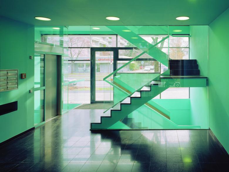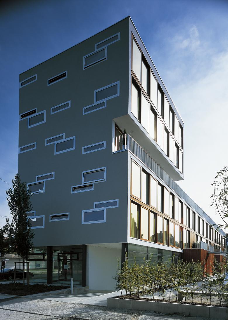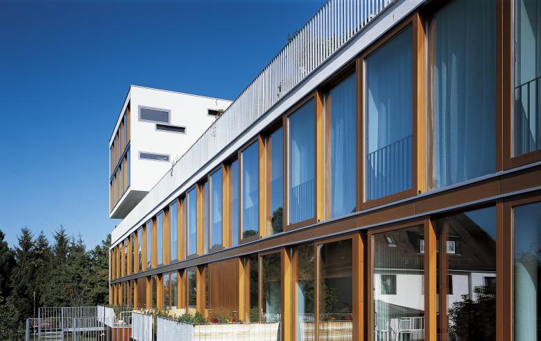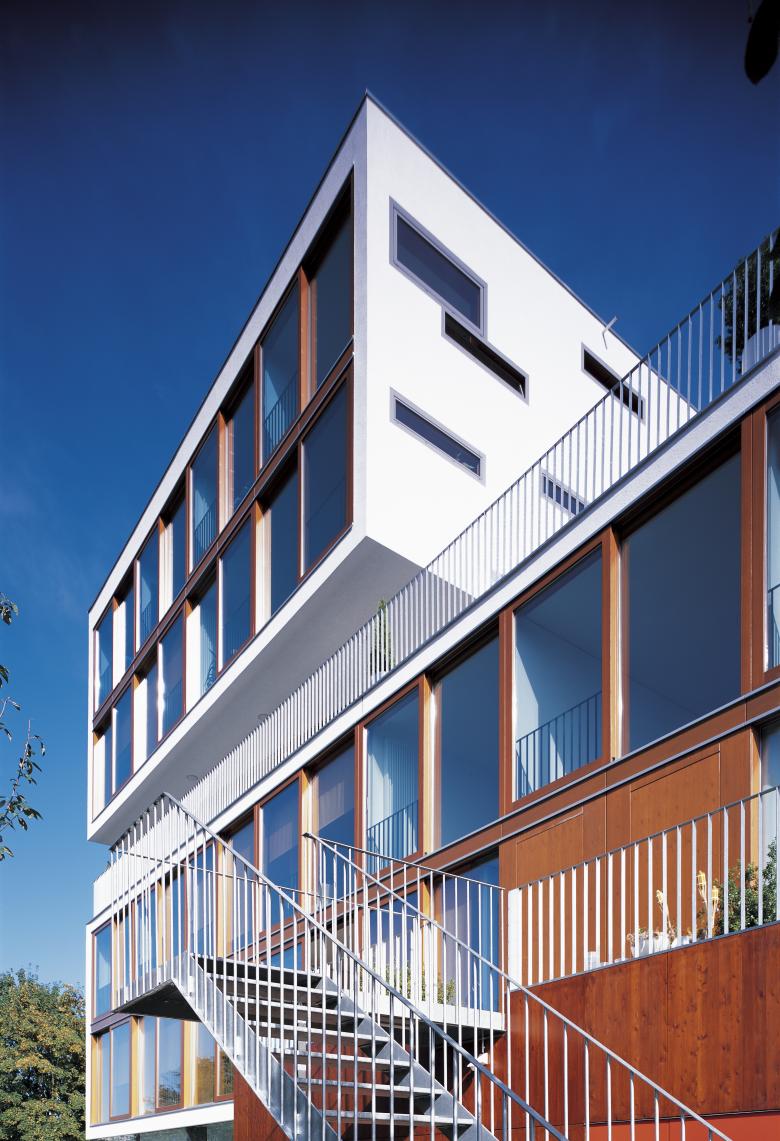 Die besondere Erschließungstypologie mit Laubengang beziehungsweise direkten Zugängen von der Gartenseite erspart in der Gesamtkonzeption ein komplettes Treppenhaus inklusive Aufzug und führt wegen der sehr geringen Verkehrsfläche zu einem überdurchschnittlichen guten Verhältnis von Bruttogrundfläche zu Wohnfläche.