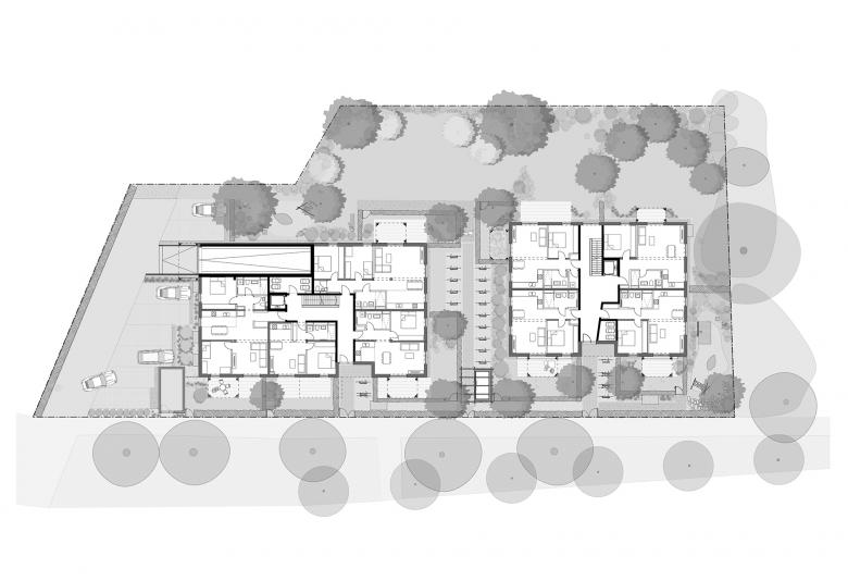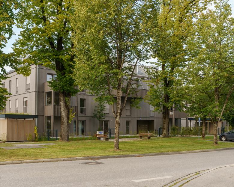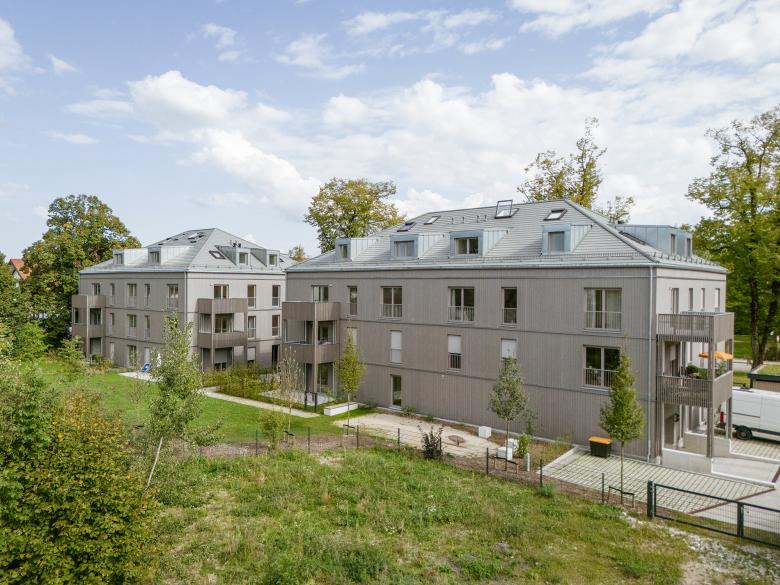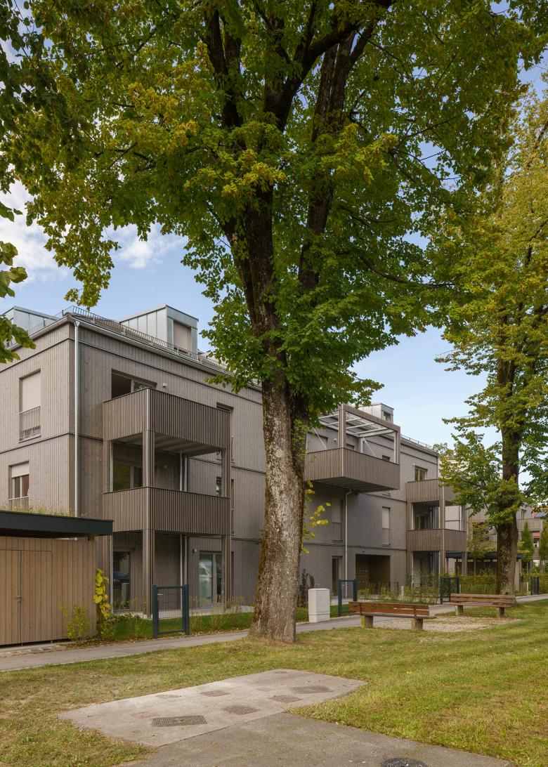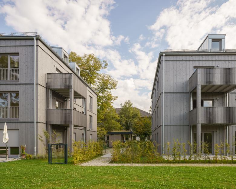 Eine besondere Aufgabe des Entwurfes war das Zusammenbringen der hieraus resultierenden Anforderungen an Wohnungsmix und -größen sowie den Vorgaben der Stellplatzsatzung mit einer für für den Holzbau sinnvollen Gebäudestruktur die eine wirtschaftliche Ausführung mit hohem Vorfertigungsgrad und bestenfalls typengleichen Bauteilen ermöglicht. Die beiden Gebäude sind in Holzbauweise nach Förderkriterien des KfW55-Standards konzipiert. Alle Wohnungen erhalten großzügige Freibereiche in Form von vorgestellten Balkonen sowie Terrassen im Erdgeschoss. Die Fassade erhält eine geschossweise getrennte vertikale Holzverkleidung aus einer grau beschichteten Fichtenschalung. Die Fensterelemente sind raumhoch aus farblich an die Fassade angepassten Holz-Aluminiumprofilen.