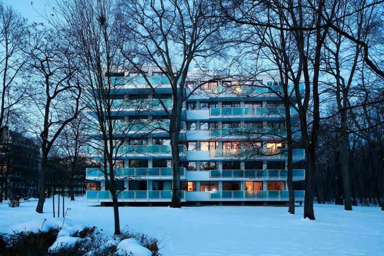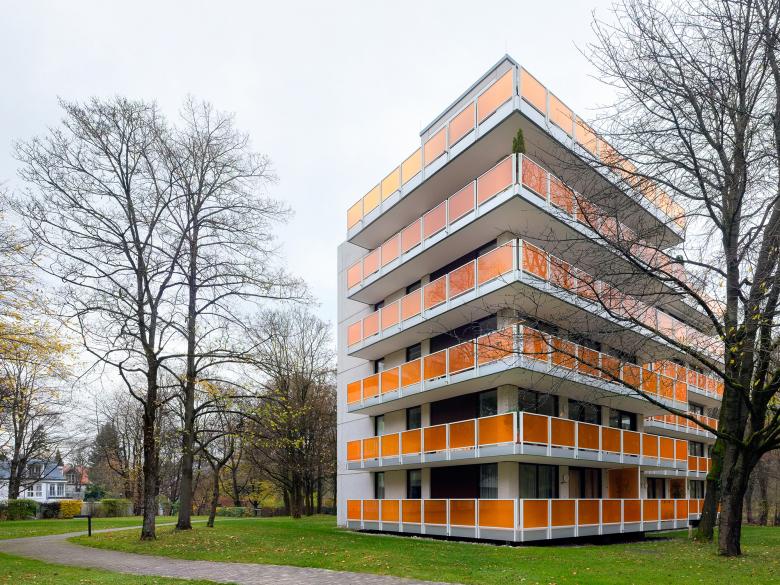 Beim gezeigten Projekt handelt es sich um die Sanierung von vier baugleichen Häusern am Englischen Garten in München. Die von Professor Josef Wiedemann 1970 am Rande des Englischen Gartens gebauten Häuser zeichnen sich durch ihre hohe architektonische Qualität aus und beinhalten insgesamt 48 Wohnungen. Nach Jahren ohne bauliche Anpassung an moderne Standards war es notwendig geworden, verschiedene Instandsetzungs- und Modernisierungsmaßnahmen durchzuführen. Unter anderem mussten dringend die Fassaden ausgetauscht und die Balkone saniert werden. Da die Fassaden der Häuser sich genau gleichen, wurde bereits im Erbauungsjahr 1970 jedem einzelnen Gebäude durch textile Sonnenschutzeinrichtungen in den Farben Blau, Rot, Gelb oder Grün seine eigenständige Identität zuteil, so dass die Häuser sich farblich voneinander unterschieden. Diese Sonnenschutzvorhänge waren bei Beginn der Baumaßnahmen nur noch rudimentär vorhanden. Da uns die Idee der Adressbildung durch Farben für die grundsätzlich baugleichen Gebäude gut gefiel, wurde sie von uns aufgegriffen und weitergeführt: Die gläsernen Brüstungen wurden für jedes Haus individuell mit einer Farbe besetzt. Insgesamt 1.500 m beträgt die Gesamtlänge der umlaufenden Balkone. Der für uns interessante Aspekt der Arbeit in der Osterwaldstraße war der Umgang mit bestehender Bausubstanz der Siebziger Jahre und der Arbeit des renommierten Professors Josef Wiedemann. Ein in den Fünfziger Jahren in München stark am Wiederaufbau der Stadt beteiligter Architekt, der für viele Kirchenbauten der Sechziger und Siebziger Jahre verantwortlich zeichnet. Der behutsame Umgang mit dem Vorhandenen war uns ein wichtiges Anliegen bei den baulichen Veränderungen. Mit wenigen gezielten Maßnahmen erhalten die Häuser nun ein wertiges und modernes Erscheinungsbild.