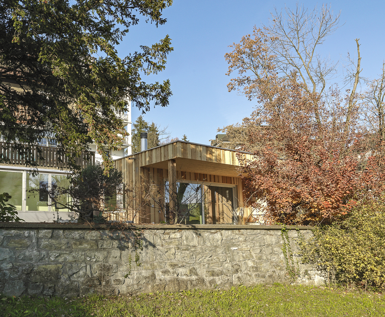 Das inventarisierte alte Wohngebäude aus Familienbesitz erhielt einen flachen länglichen Anbau aus Holz, welcher direkt an den Park hinter der Museggmauer angrenzt. Im Sinne eines "Stöcklis" dient der dazugewonnene Raum einem Teil der Familie als Wohn- und Kunstatelier.