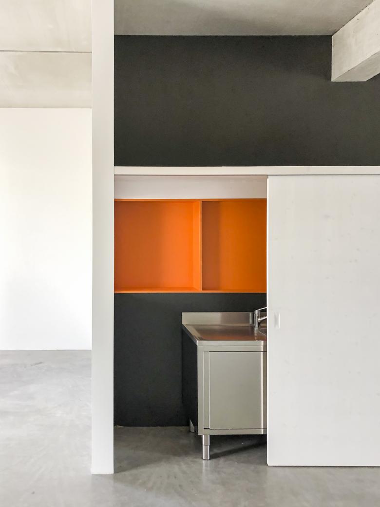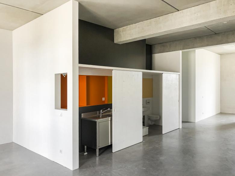 Das Atelier 2.02 in der Erlenmatt wurde für zwei Künstlerinnen nach ihren spezifischen Bedürfnissen in zwei Einheiten für Hallen-Wohnen und Arbeitsatelier konzipiert. Der Innenausbau wurde nach strengen ökonomischen Prinzipien umgesetzt.